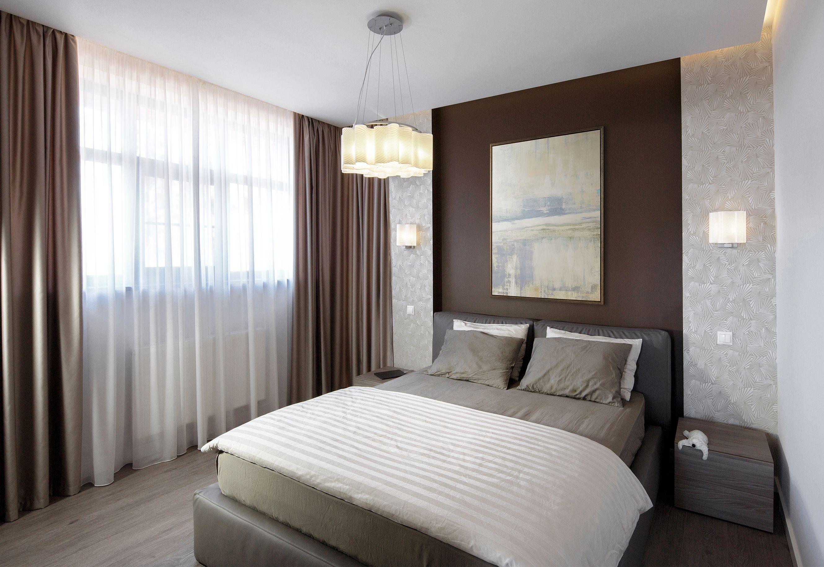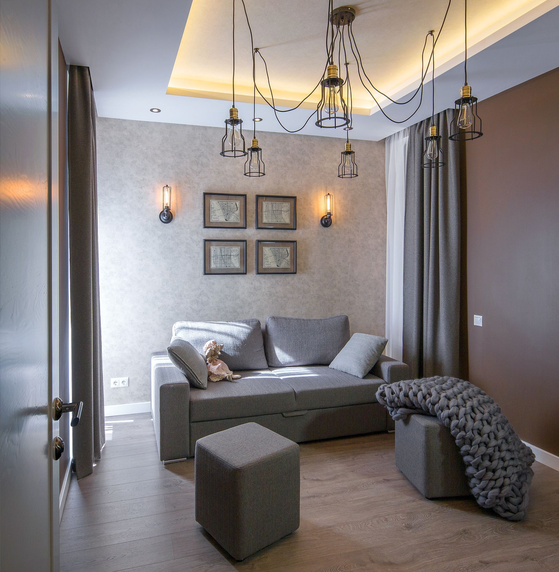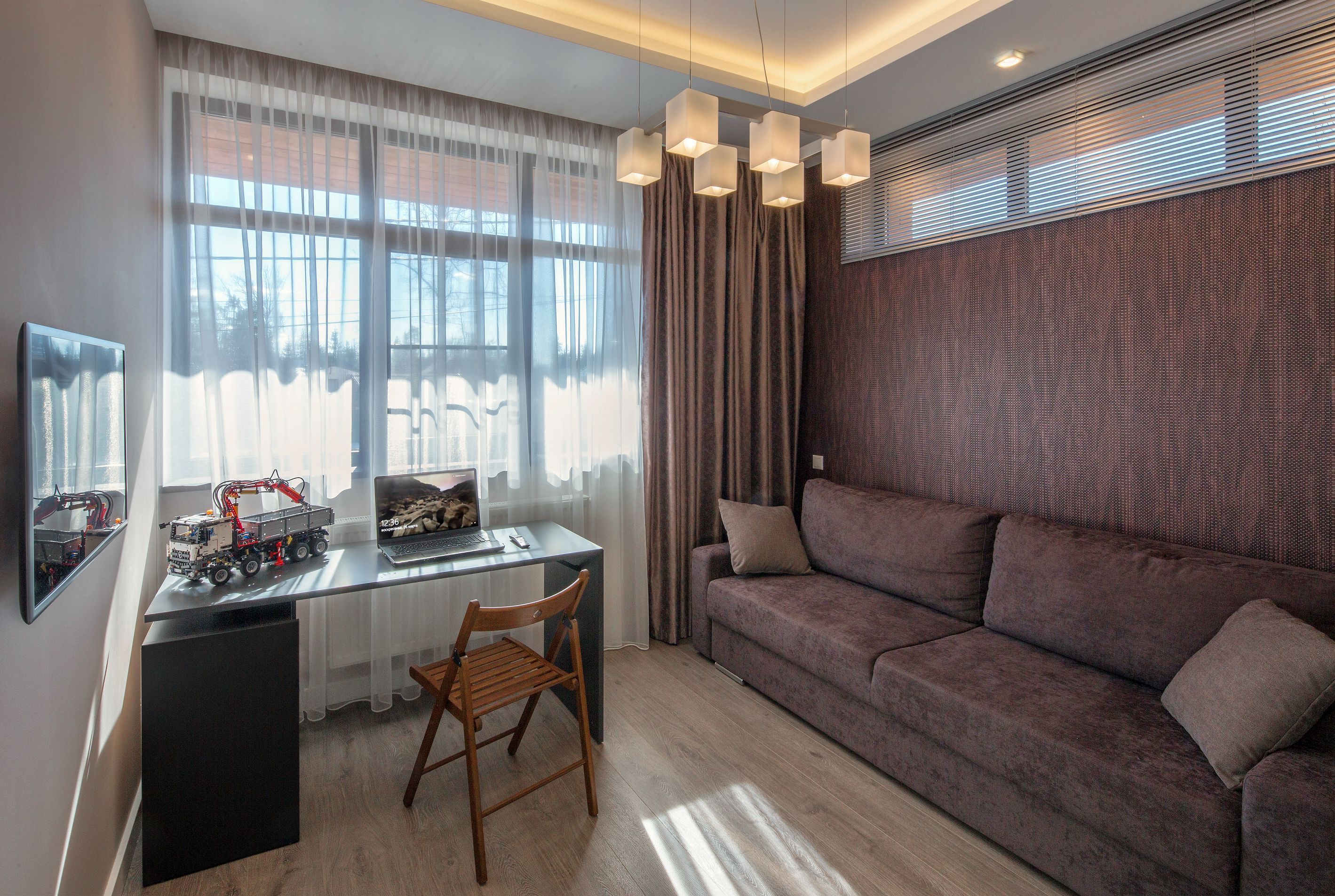 Поскольку это загородный дом выходного дня, куда семья приезжает не часто, спальное место в комнате сына оборудовано раскладным диваном. Чтобы исключить сильные акцентные пятна, здесь я использовала подбор цветов тон-в-тон: шоколадные обои практически сливаются с обивкой дивана, что увеличивает пространство комнаты.