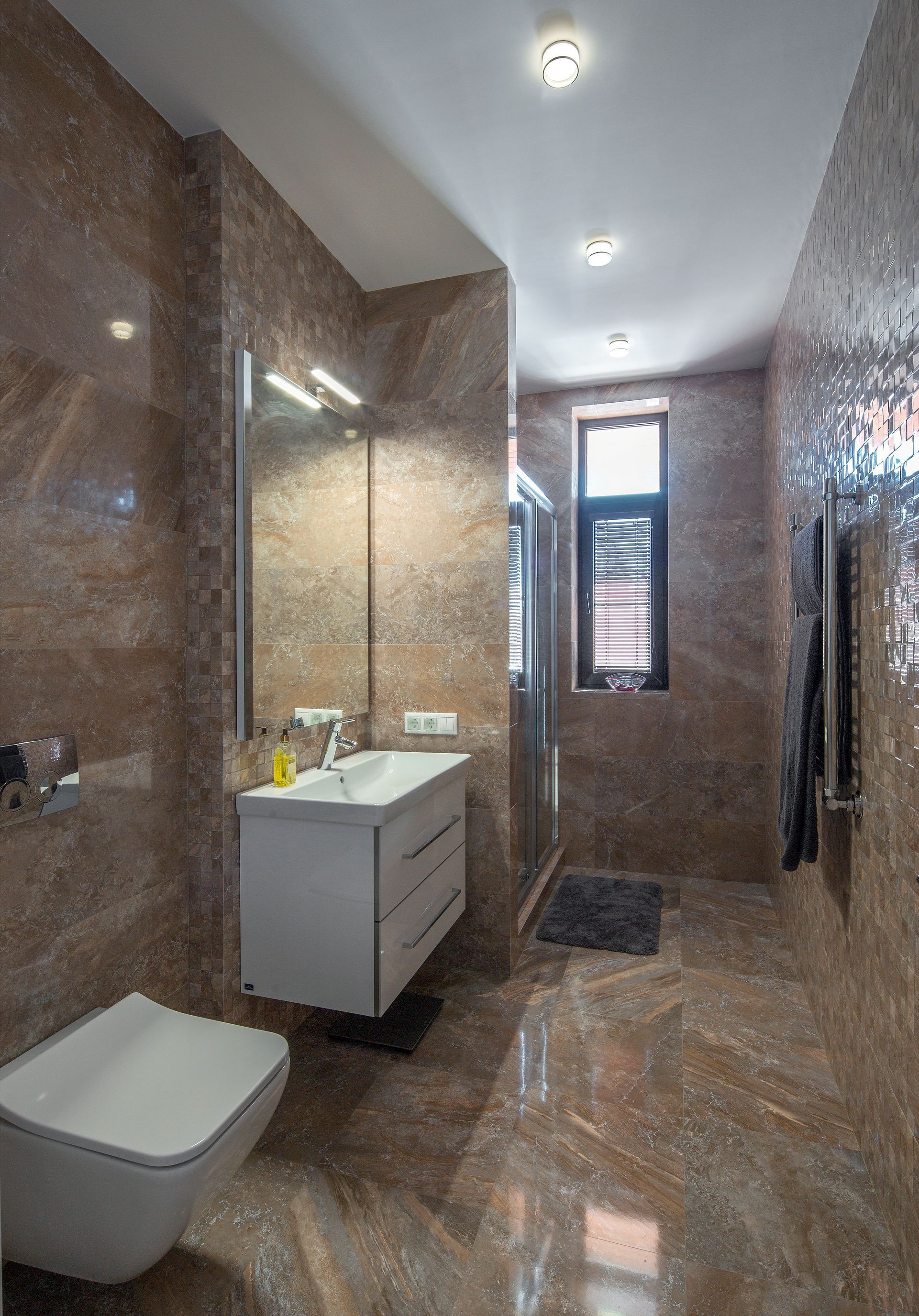 Плитка на полу имитирует паркетную доску и добавляет в интерьер тепла причем в прямом смысле: под ней установлена система теплого пола. Доска на потолке повторяет цветовую гамму плитки и помогает избежать ощущения белого больничного интерьера. Также паркетная доска визуально связывает оба яруса дома: на втором этаже ей оформлен пол.