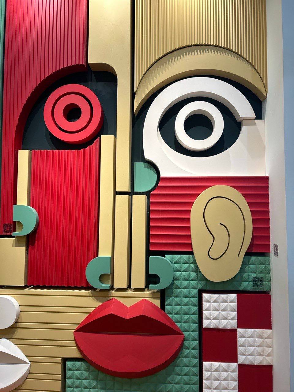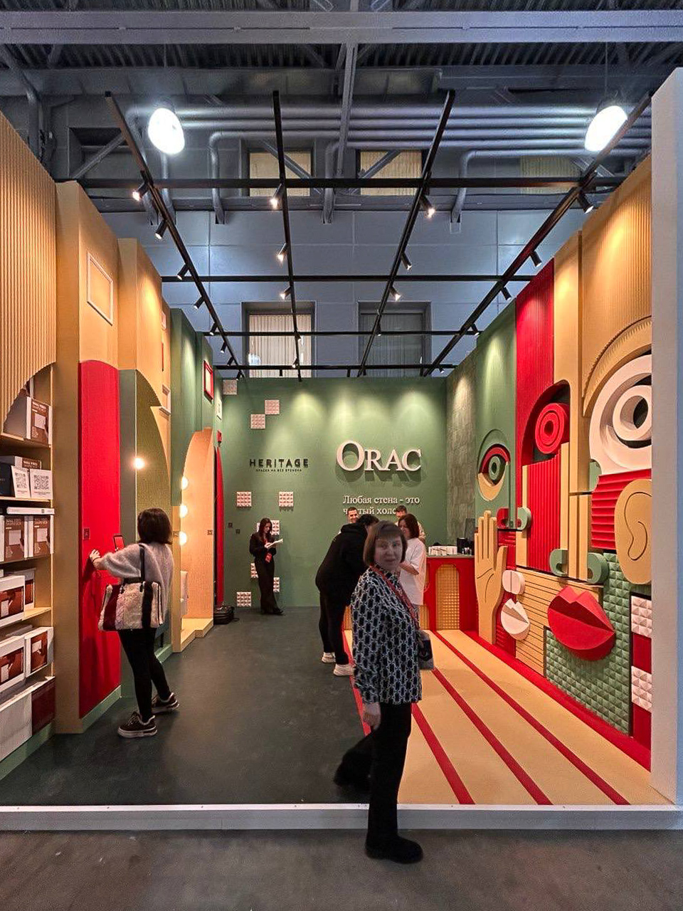 Главный акцент экспозиции — огромное человеческое лицо, собранное из декоративных панелей Orac и окрашенное красками Heritage. Этот образ действовал как магнит: посетители останавливались, фотографировались, обсуждали идею. Лицо стало визуальным центром композиции и одновременно демонстрацией того, как декоративные элементы могут работать в крупном масштабе, сохраняя свою функциональность и эстетическую ценность.