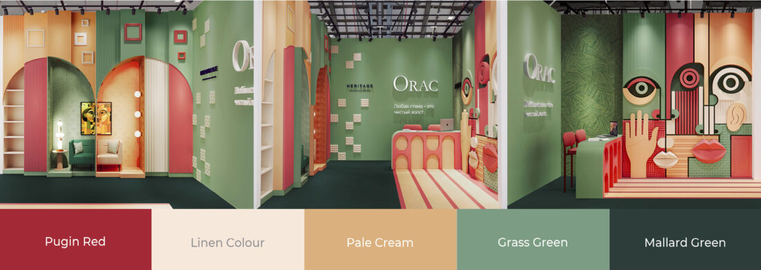 Цветовая гамма проекта — тёплые терракотовые, бежевые, персиковые и приглушённые зелёные ноты из палитры Heritage — была подобрана так, чтобы создавать баланс между уютом и драматичностью. Эти оттенки подчёркивали фактуру панелей, делая объёмные формы более выразительными. Дополнительную роль сыграли обои Arte, которые плавно поддерживали общую палитру и помогали объединить отдельные элементы стенда в единую композицию.