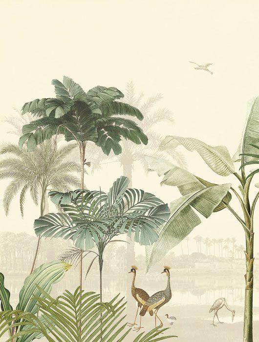 Панно с живописной лагуной, пальмами и птицами