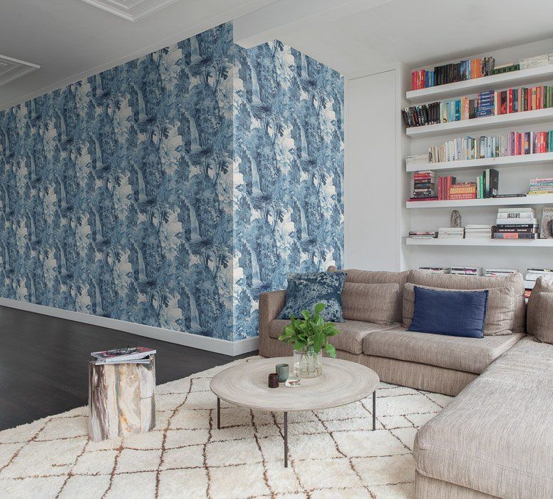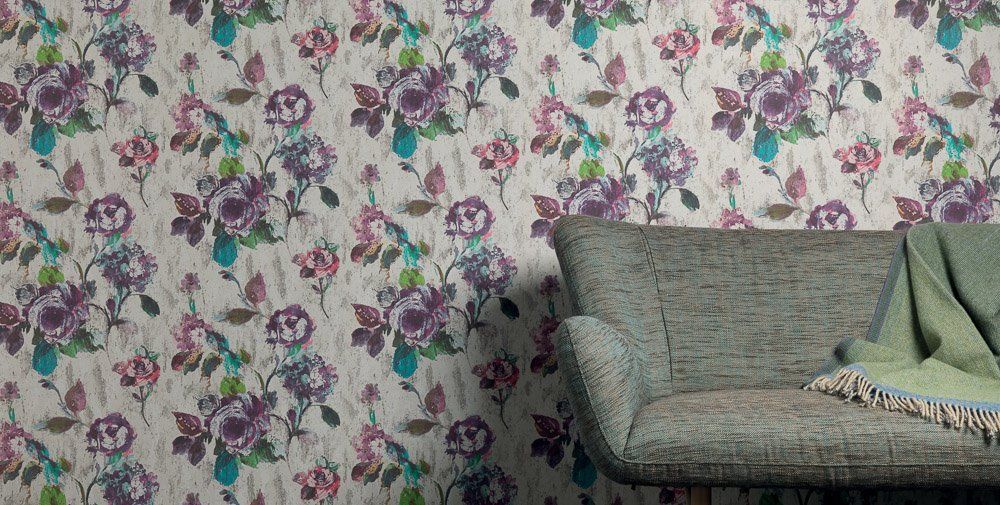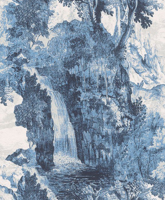 Обои с рисунком лесного водопада выполнены в семи цветовых вариантах, среди которых смелые комбинации фиолетового с желтым и бордового с серым.
