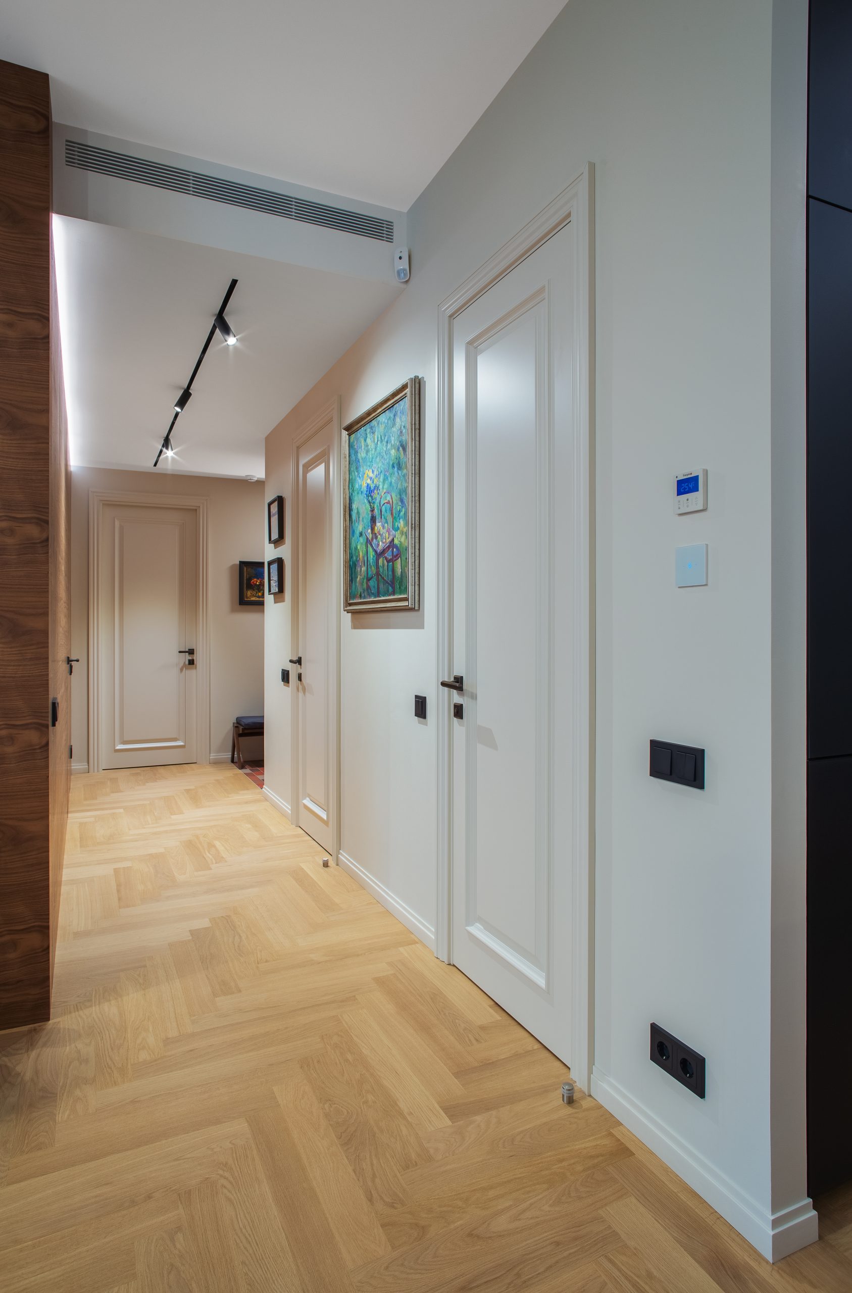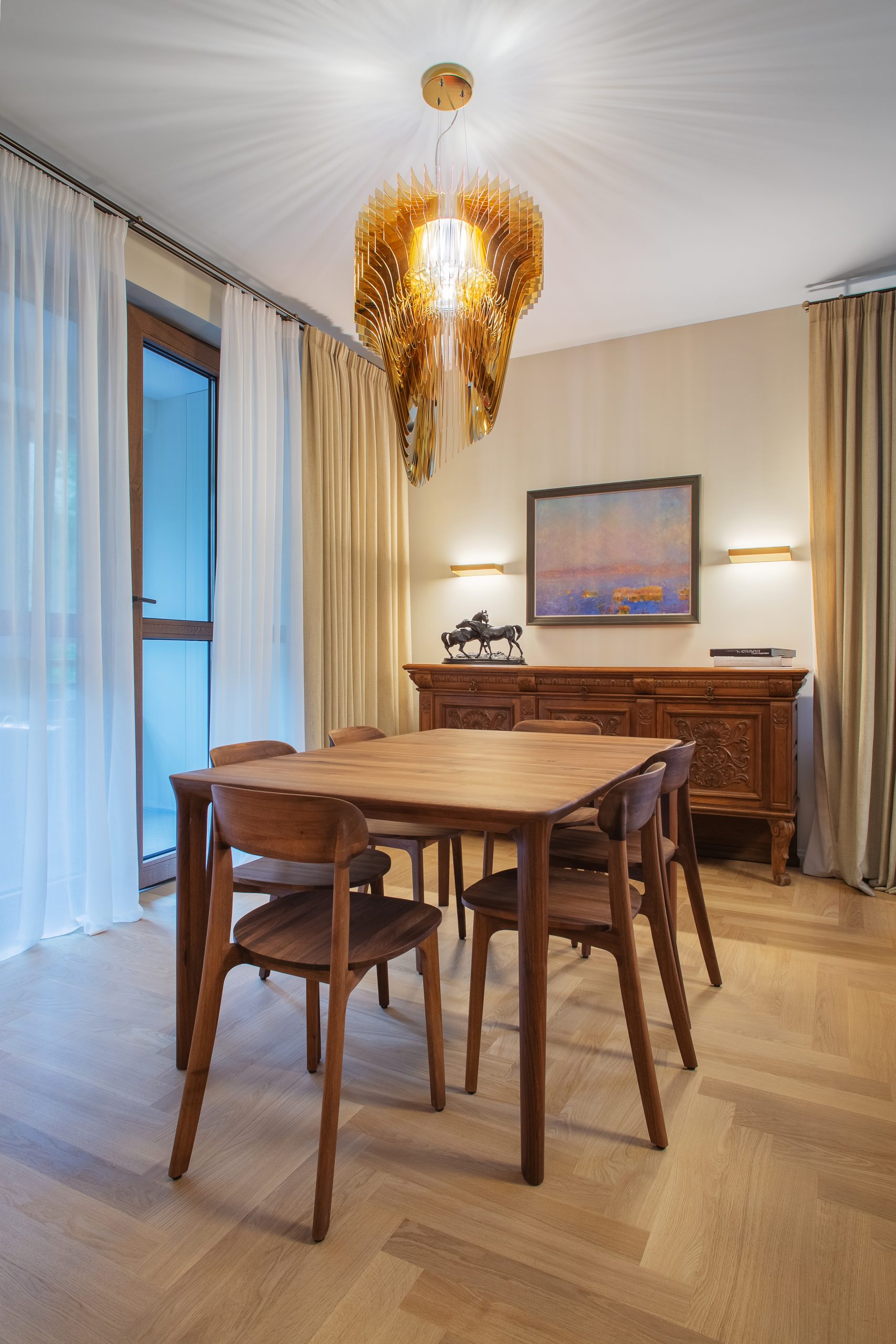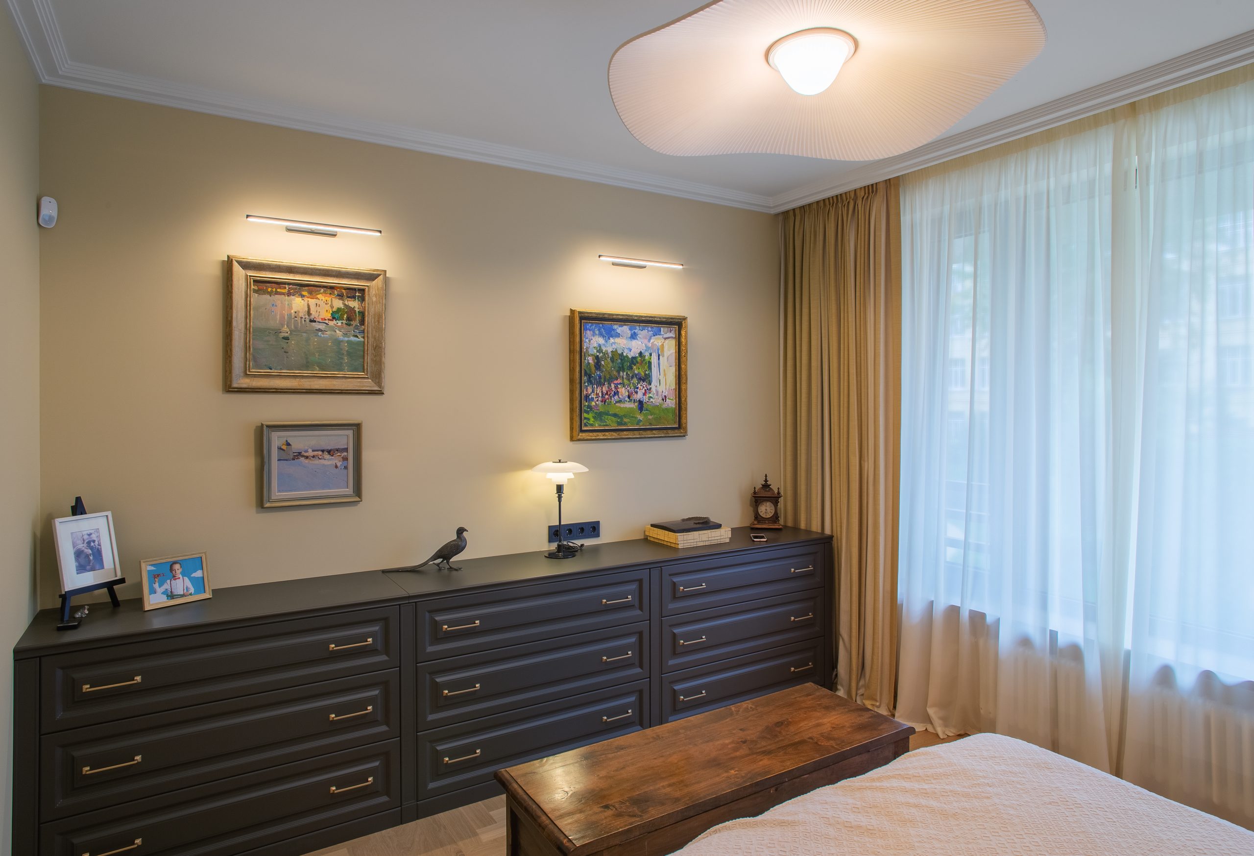 Квартира имеет современный облик с включениями элементов неоклассики и есть даже антикварный классический комод.