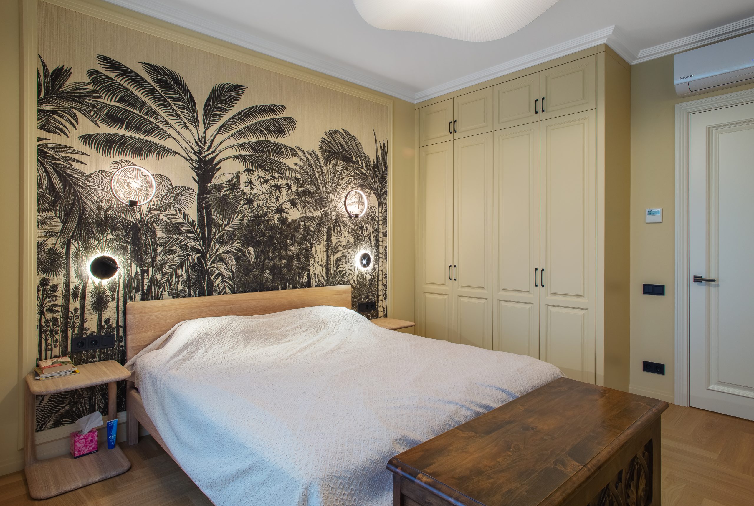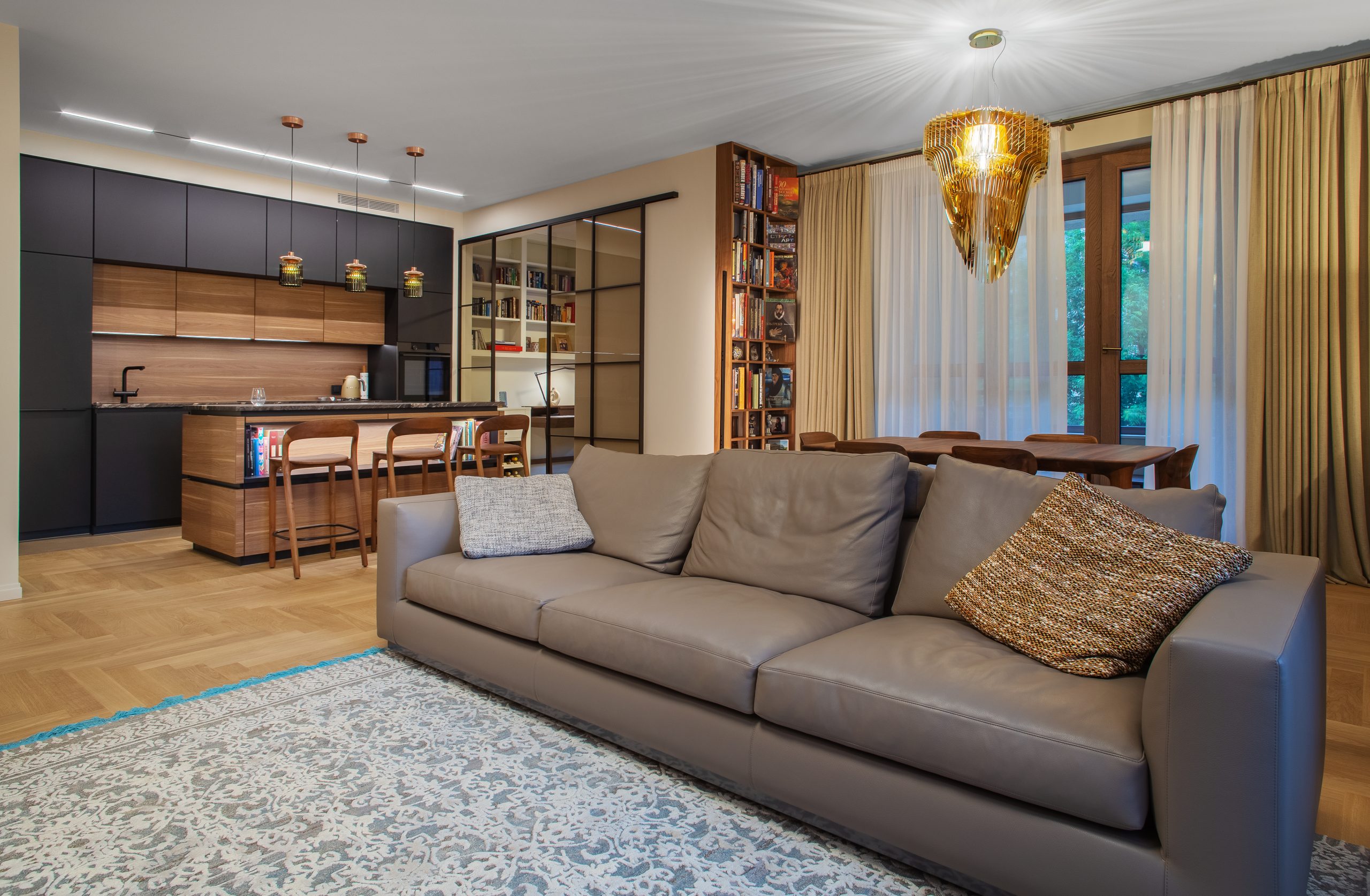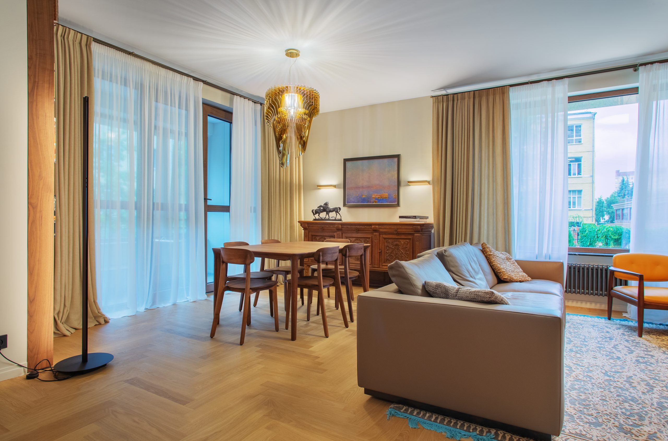 Квартира имеет современный облик с включениями элементов неоклассики и есть даже антикварный классический комод.
