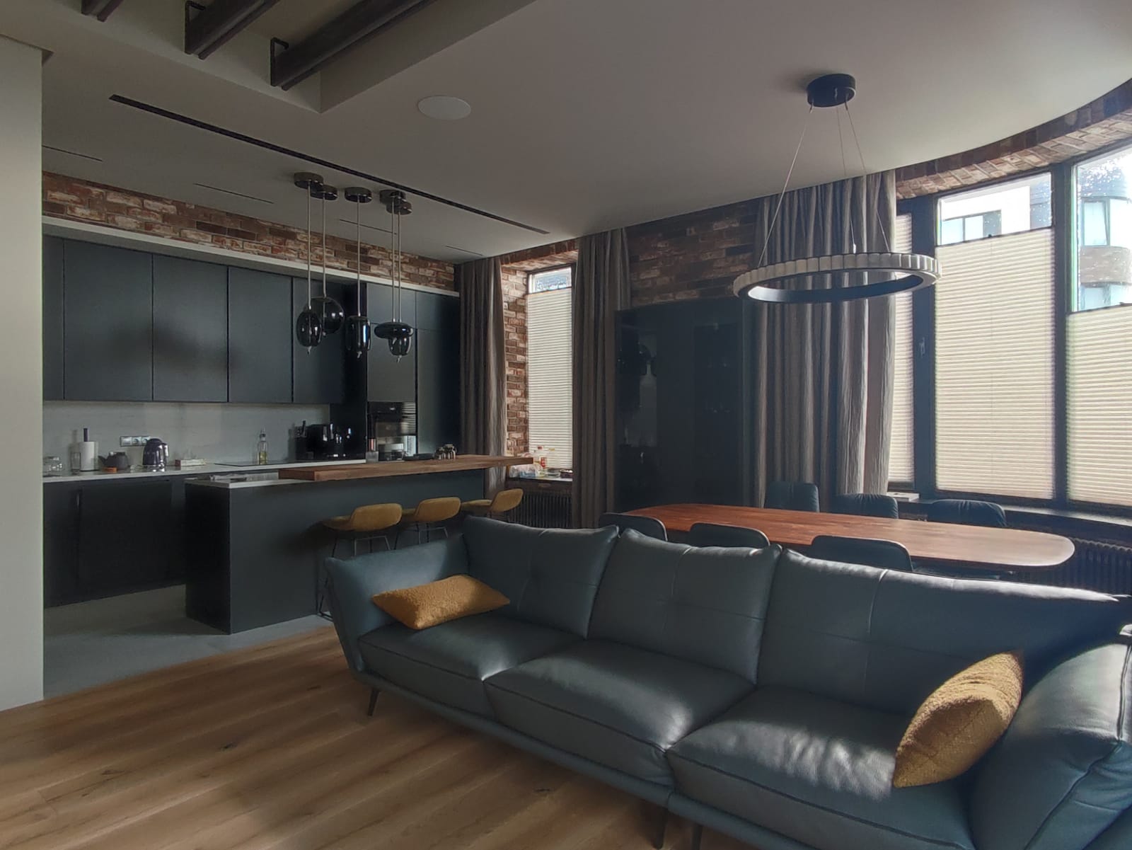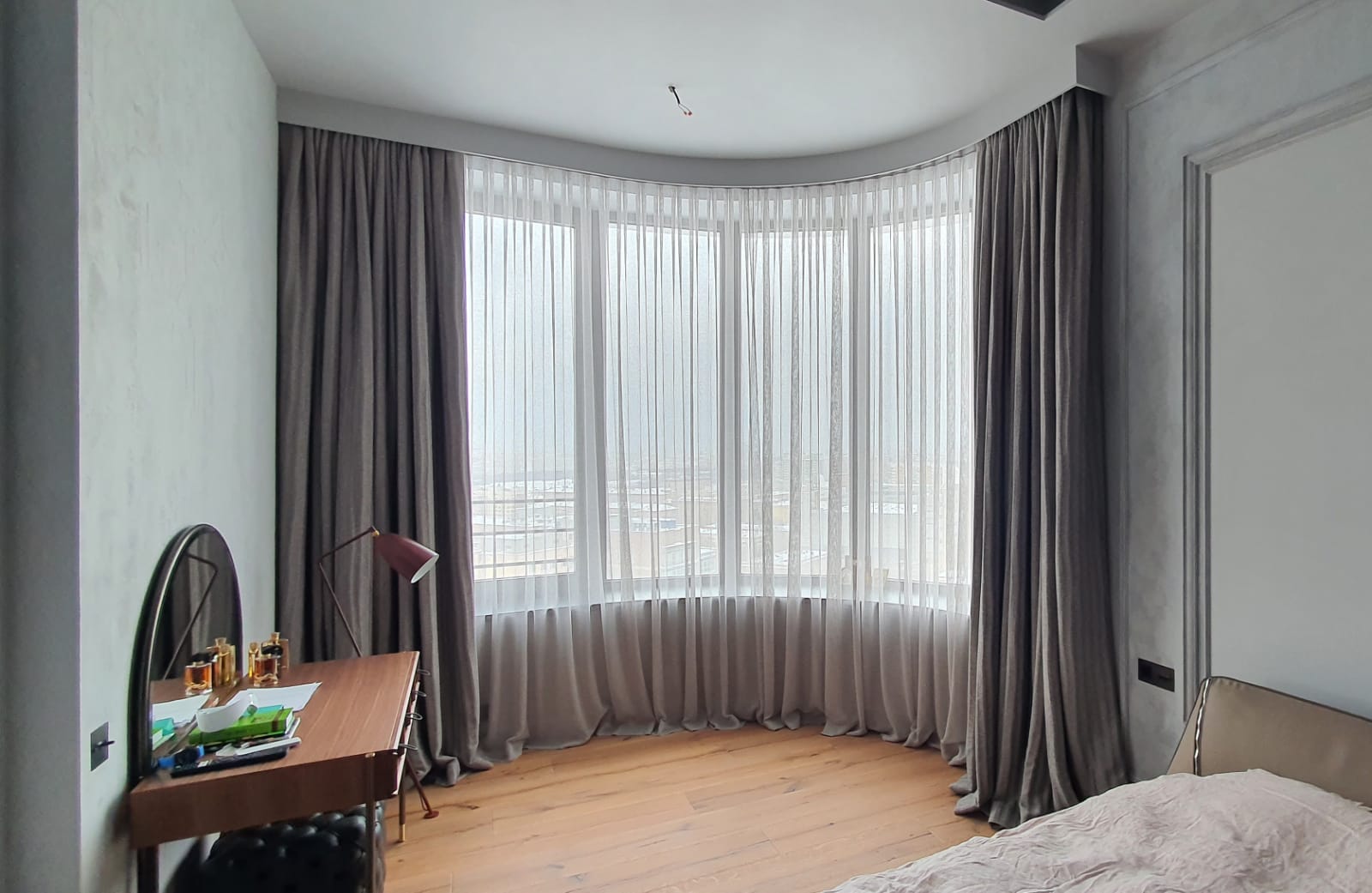 Дизайнер Степаненко Ольга совместно с дизайнером по текстилю компании Ампир Декор Градусовой Ольгой выбрали для гостиной стильное сочетание портьер из роскошной ткани от бренда Zimmer-Rohde и плиссе на раму. Плиссе установлено с возможностью открытия сверху вниз, что позволяет впустить в дом свет, но остаться невидимыми для соседей напротив, сохраняя уют и приватность для обитателей квартиры. В спальню было выбрано мягкое и спокойное сочетание портьер и тюля из тканей от бренда Zimmer-Rohde. А детская комната оформлена римской шторой из плотной ткани, закрывающейся на ночь, и плиссе на раму, как защиту от солнца днем.
