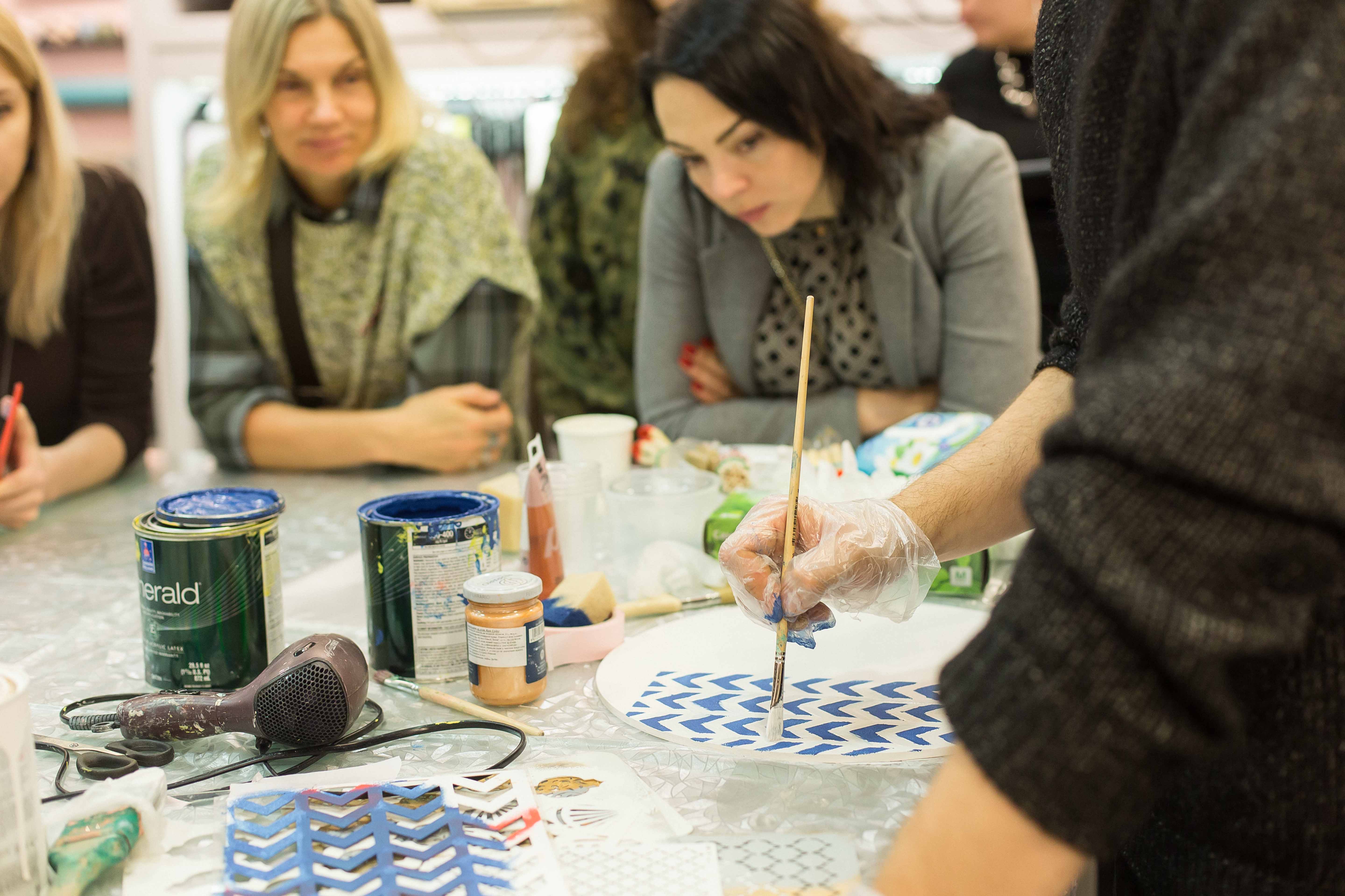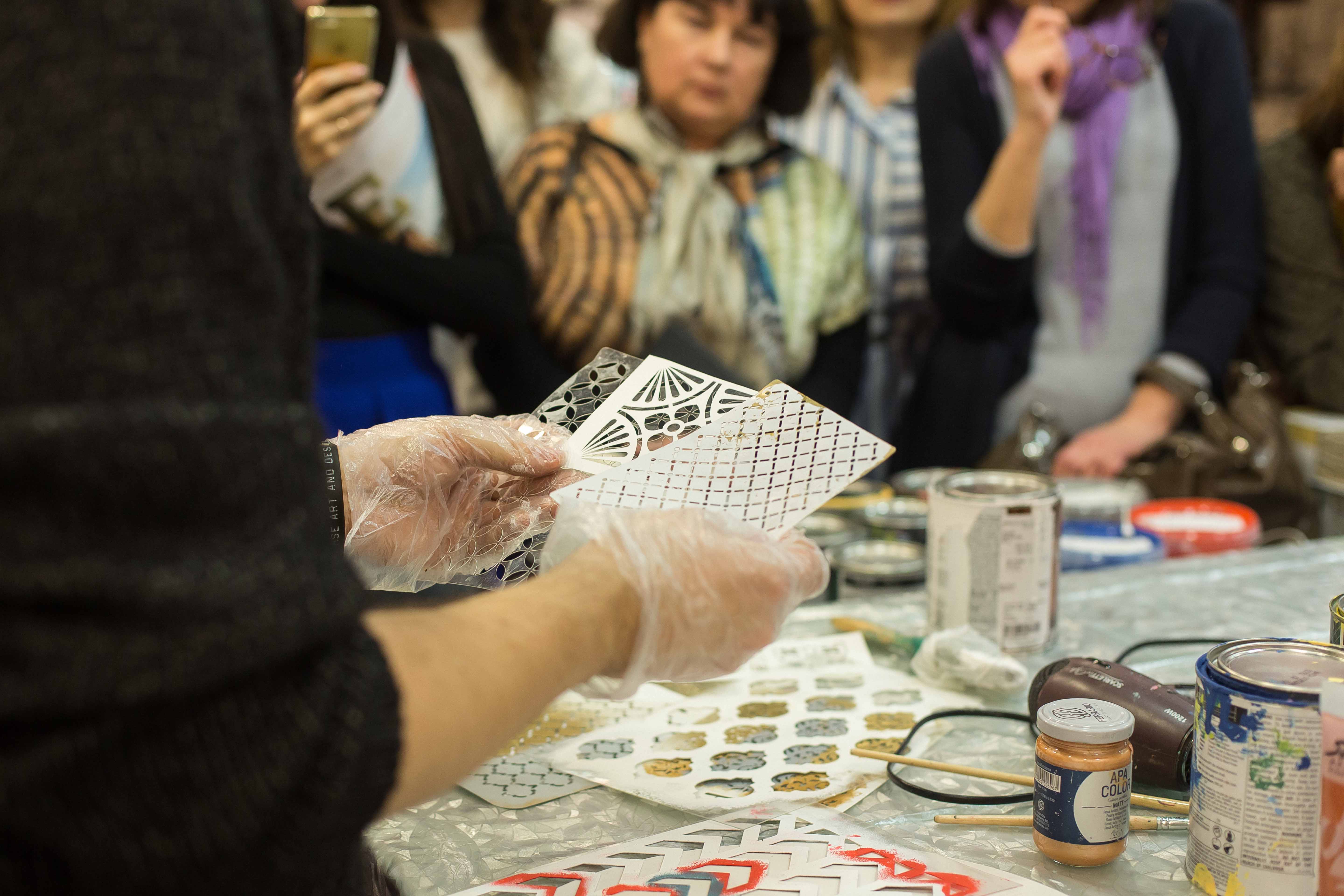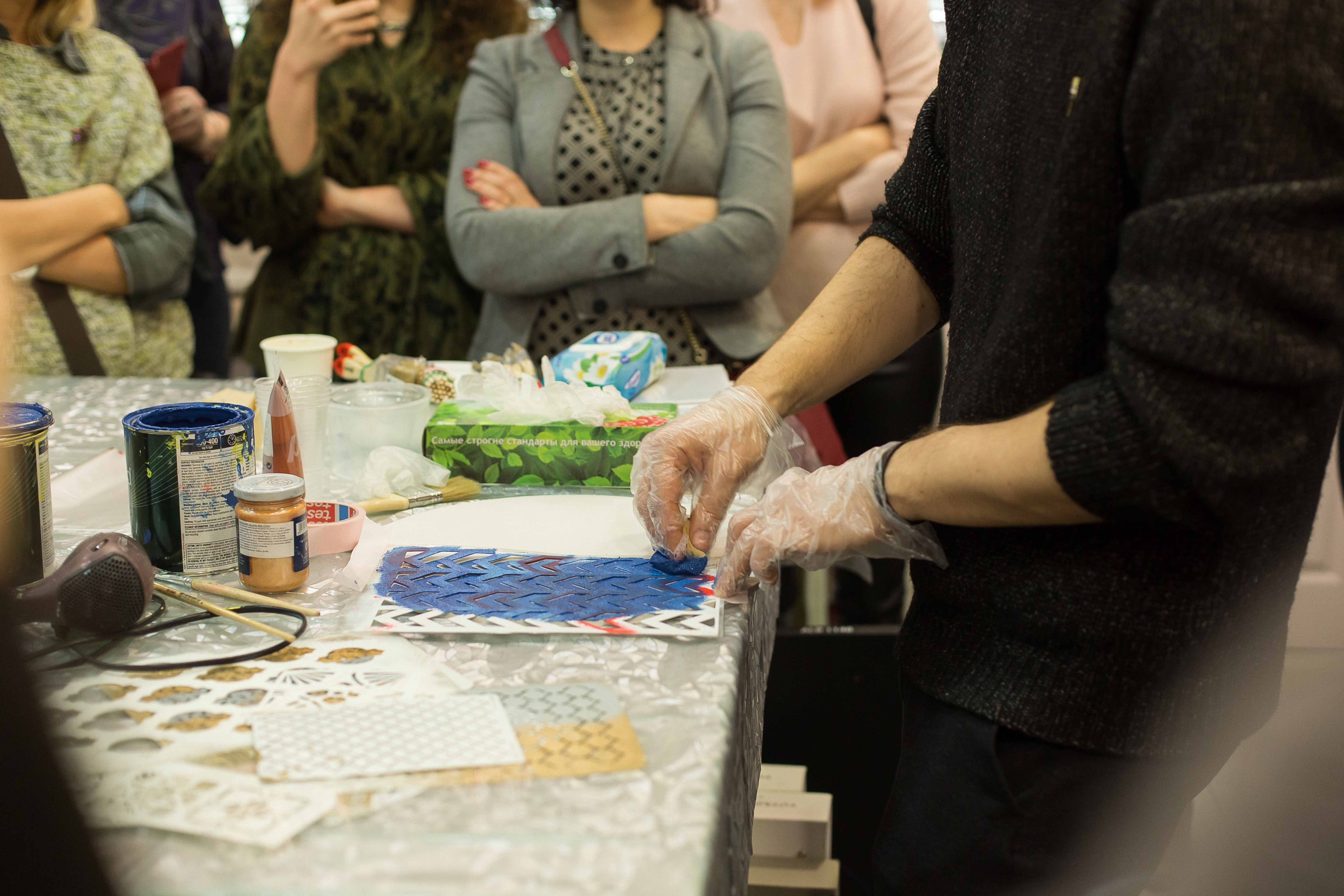 В практической части встречи Александр продемонстрировал различные декоративные техники, включающие работу с фактурами и цветовой палитрой. Гости с интересом наблюдали за процессом и задавали вопросы.