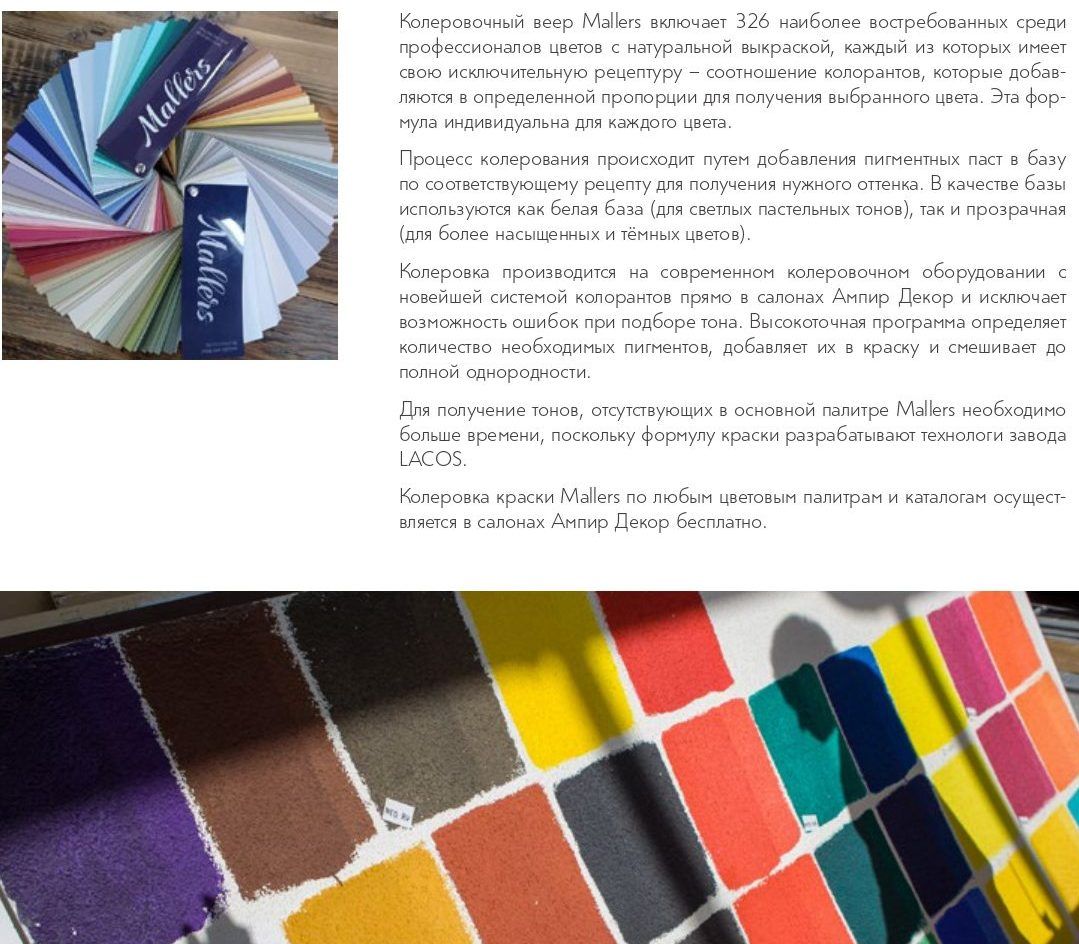 LACOS coatings – предприятие, где производится краска Mallers. Завод оснащен оборудованием с высоким уровнем автоматизации: Oliver&Battle (Испания), Netzsh (Германия), Mettler Toledo (Швейцария), Honeywall (США), ABB (Германия). Вся продукция производится из сырьевых материалов лидеров мировой химической индустрии (RHODIYA, OMYA, OMNOVA SOLUTIONS, DOW, BASF и др.)