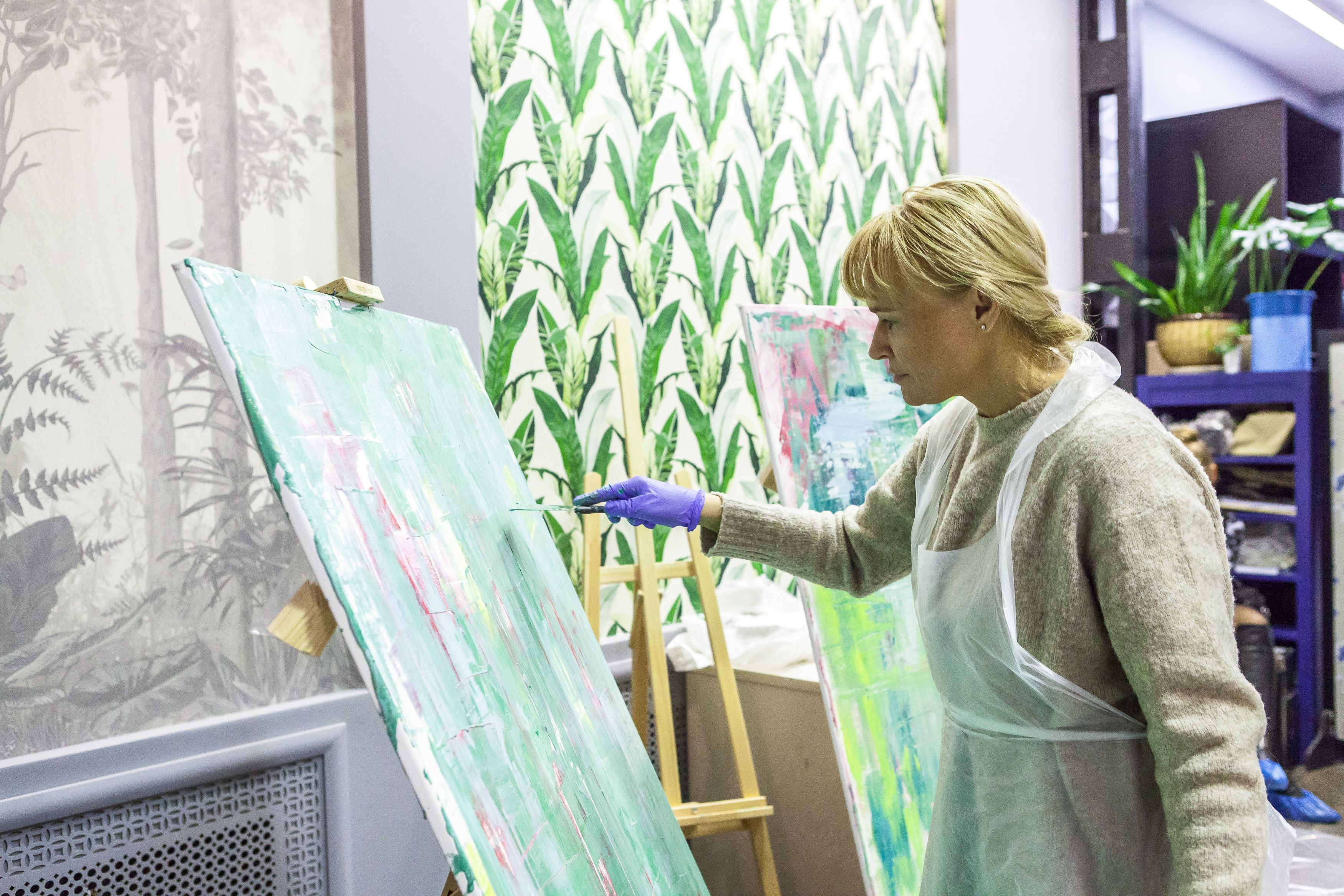 Крупноформатная живопись — занятие довольно затратное. Поэтому у профессиональных художников есть собственные секреты в выборе материалов. Так, Юлия Удалова уже не первый год использует в работе акриловые краски Sherwin-Williams. Преимущества выбора очевидны: у красок очень хорошая текстура, позволяющая работать с многослойностью на холсте, а палитра Sherwin-Williams насчитывает более 3000 цветов.