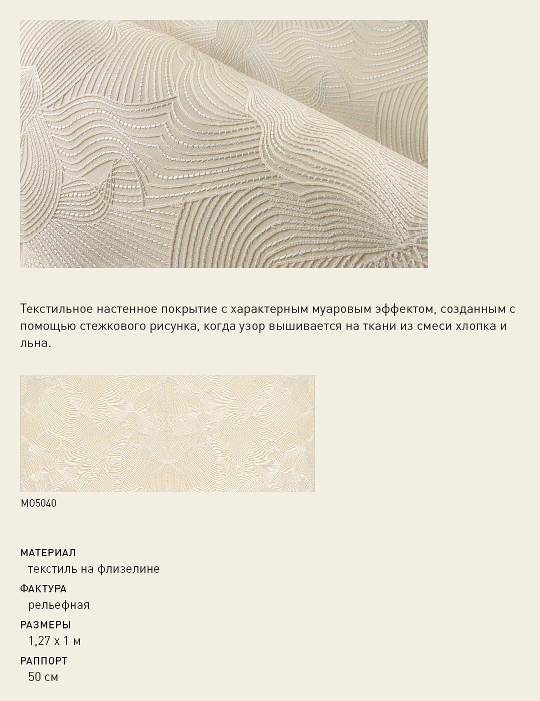 Текстильное настенное покрытие с характерным муаровым эффектом, созданным с помощью стежкового рисунка, когда узор вышивается на ткани из смеси хлопка и льна.
