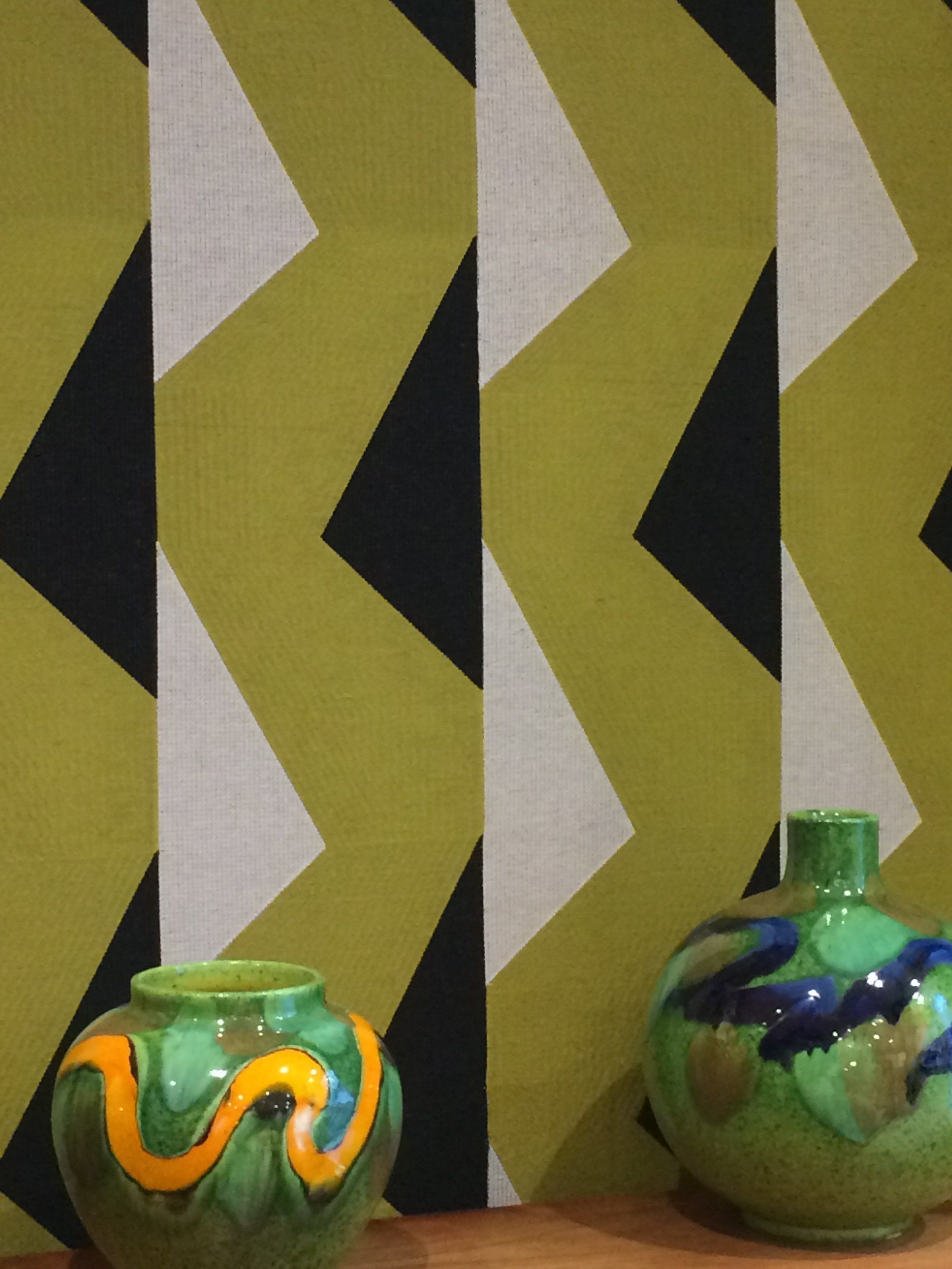 Стены бутика Pierre Frey, оформленные тканью из коллекции Gio. Коллекция Gio переосмысливает золотой век европейской архитектуры и дизайна с 1928 года по 1950 год: Баухауз основанный Вальтером Гропиусом, модернистское движение во главе с Робертом Малле-Стивенсом, Ле Корбюзье, Джио Понти. Этот стиль играет на вариациях простых геометрических форм, он сочетает в себе практицизм и эстетику.
