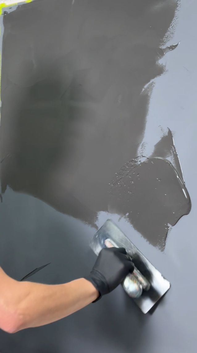 2. Нанесение базового слоя. Используется шпатель или кельма из нержавеющей стали. Толщина — не более 1 мм. Материал накладывается довольно плотным слоем, оставляя «рваные края», не выглаживается.