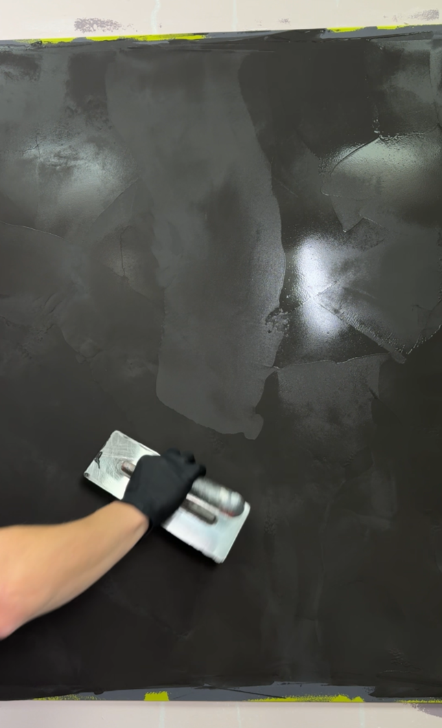 3. Формирование фактуры. После лёгкого подсыхания материала — ждем появления 50% матовости, поверхность обрабатывается мягкими круговыми движениями, приглаживается — именно в этот момент начинает появляться узнаваемая “вельветовая” глубина.