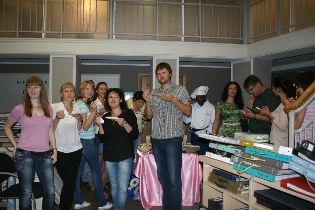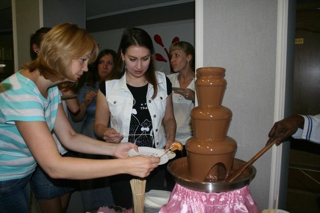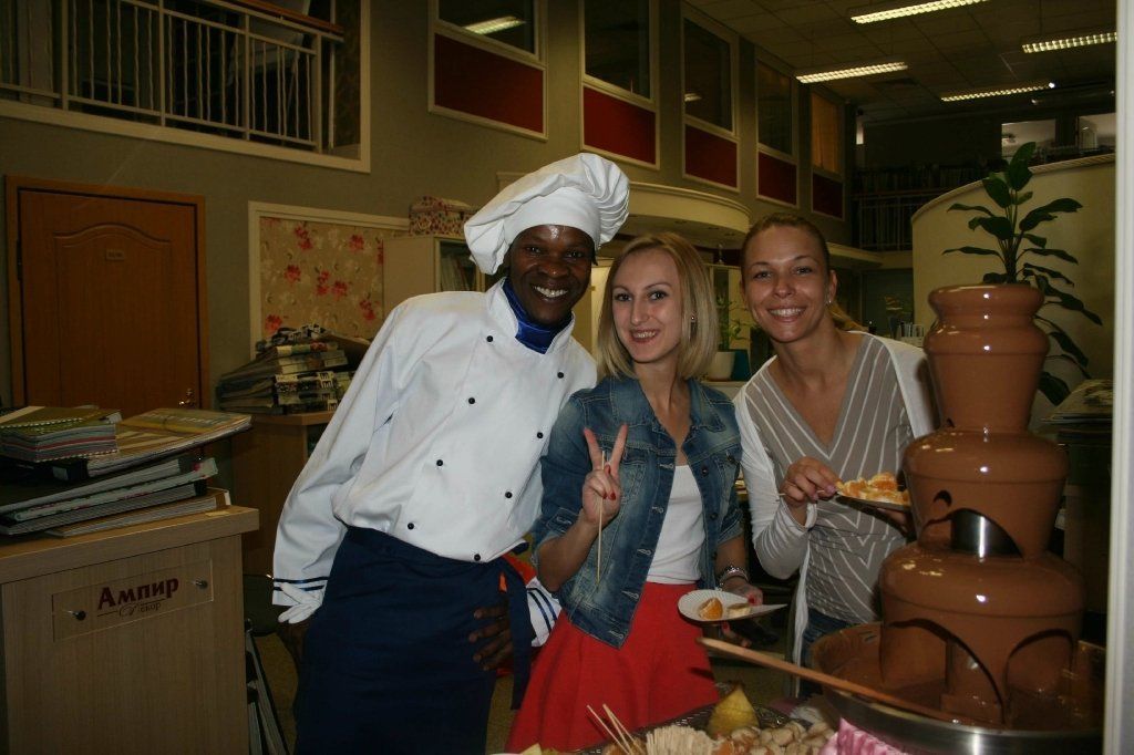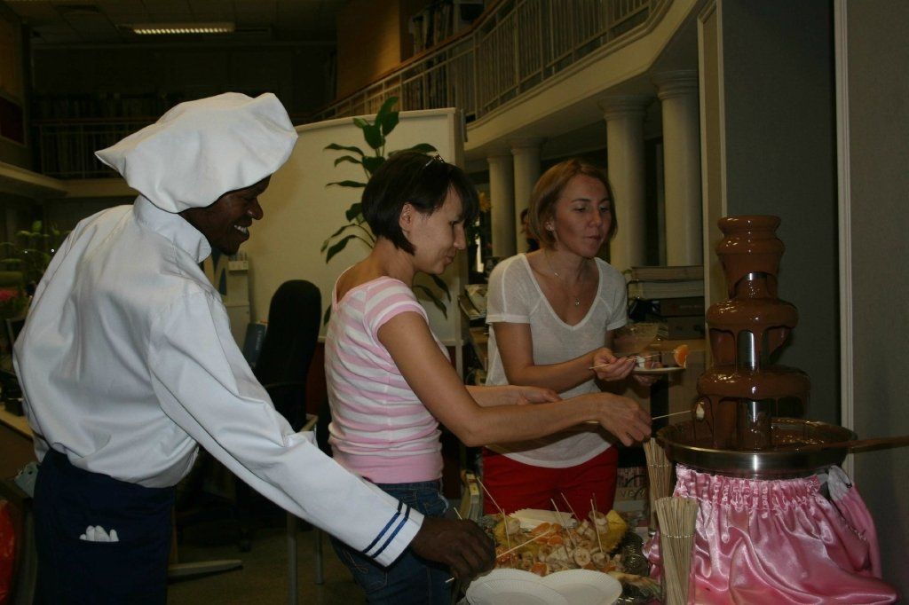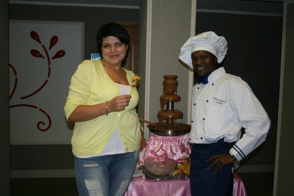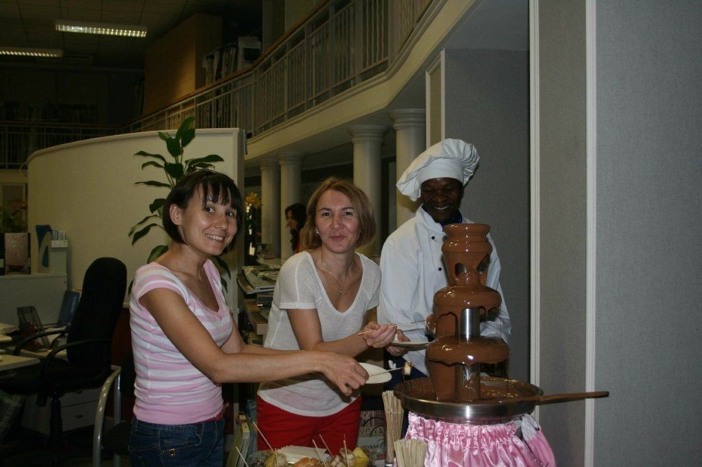В офисе даже заработал шоколадный фонтан, в который можно было окунуть кусочки фруктов. Фото на память с экзотическим шеф-поваром и хорошее настроение на весь день получили все!
