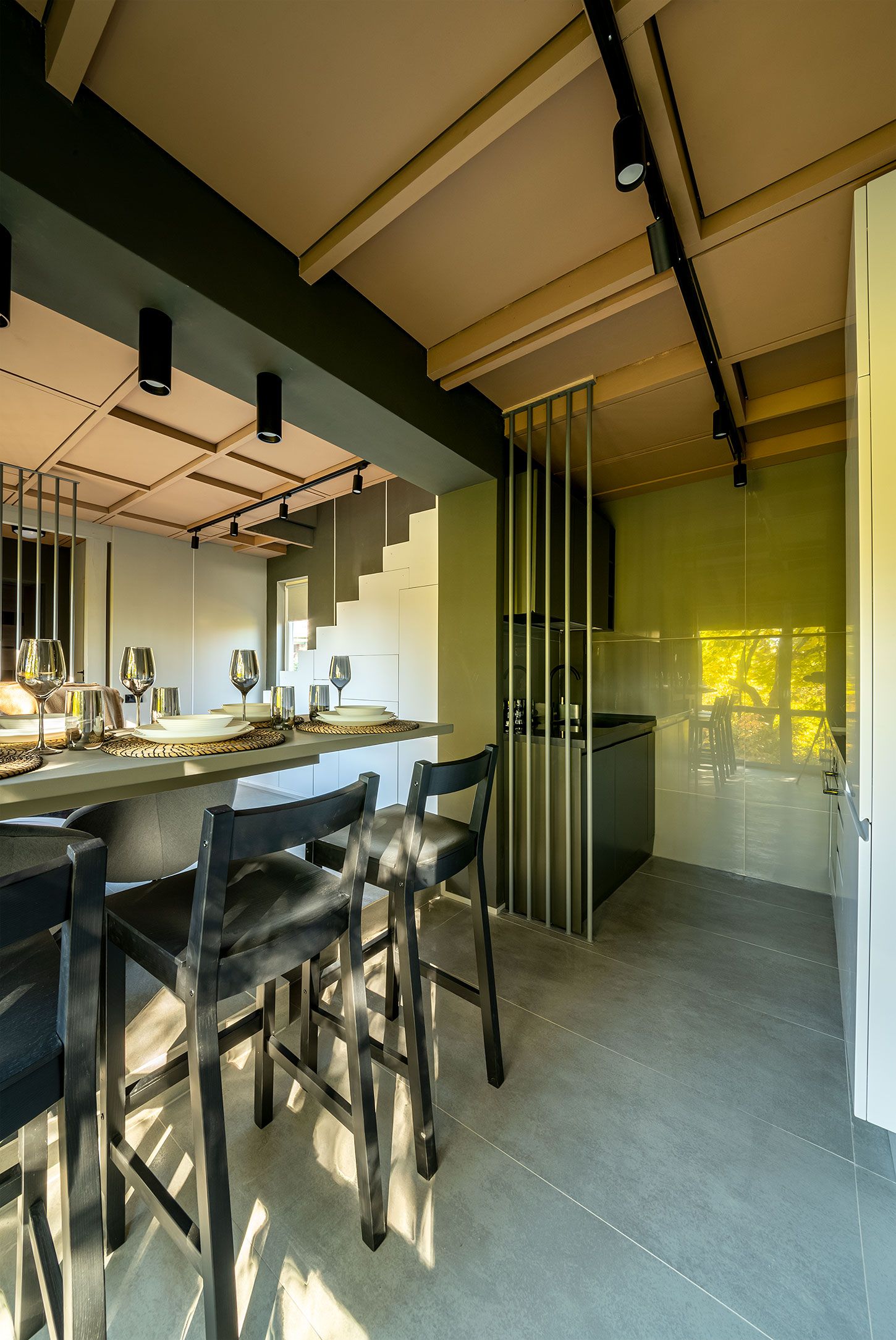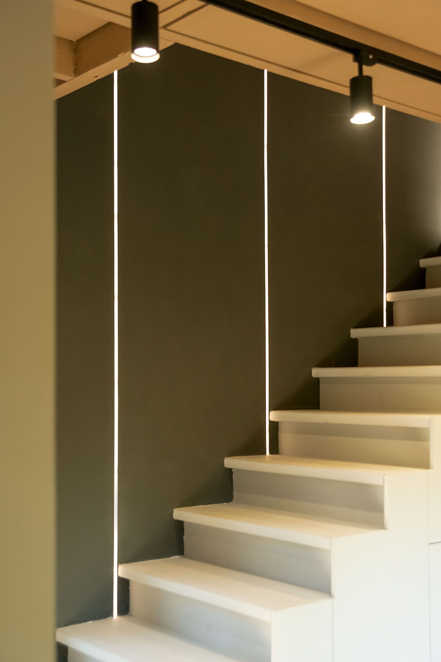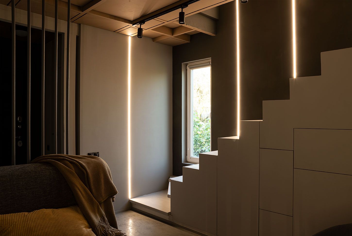 Для стен дизайнер выбрал краску Mallers Ultra Matte серого цвета. На фоне темных стен — белоснежная лестница, так же выкрашенная краской Mallers. Оттенки серого придают пространству ощущение покоя, белый — легкость.