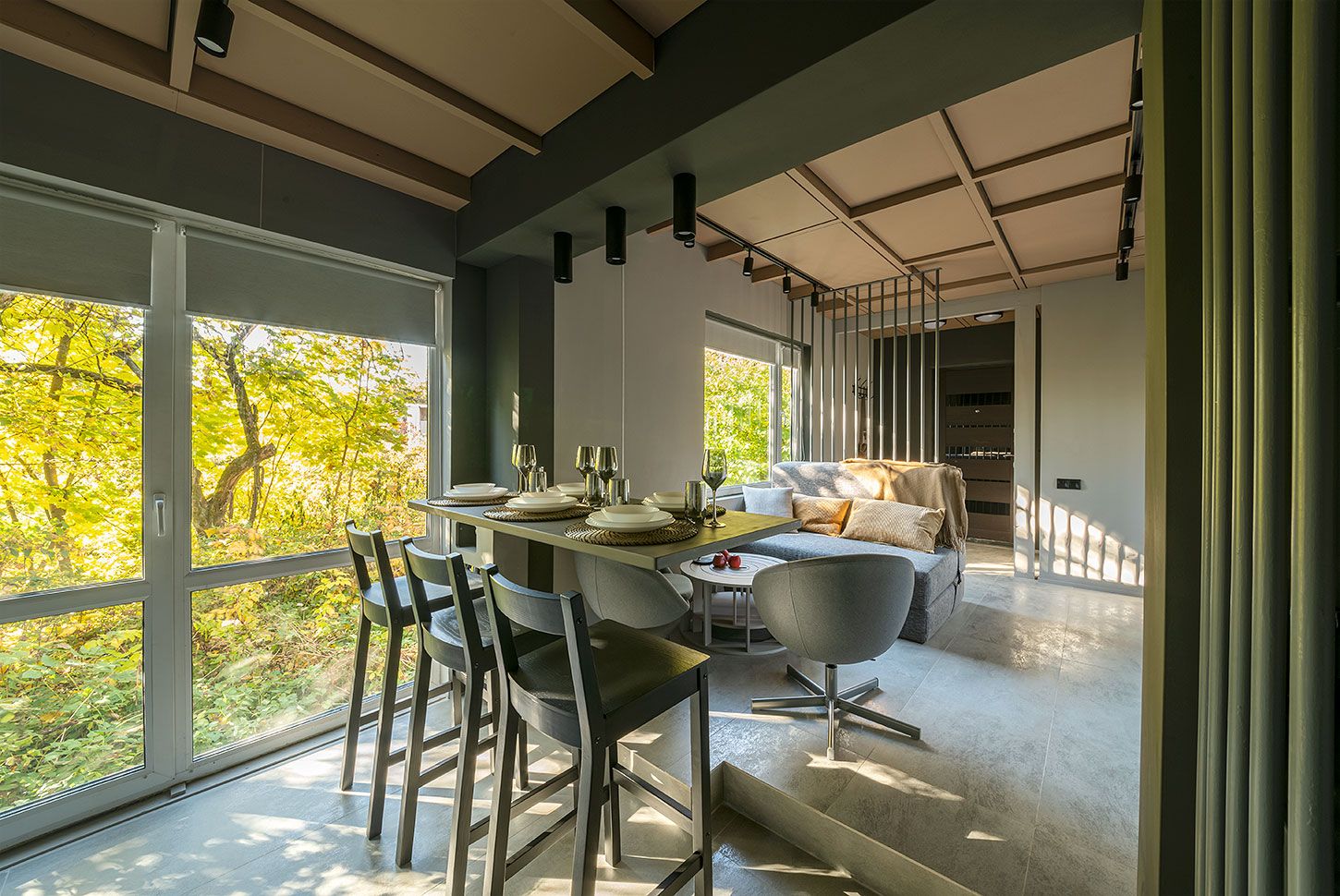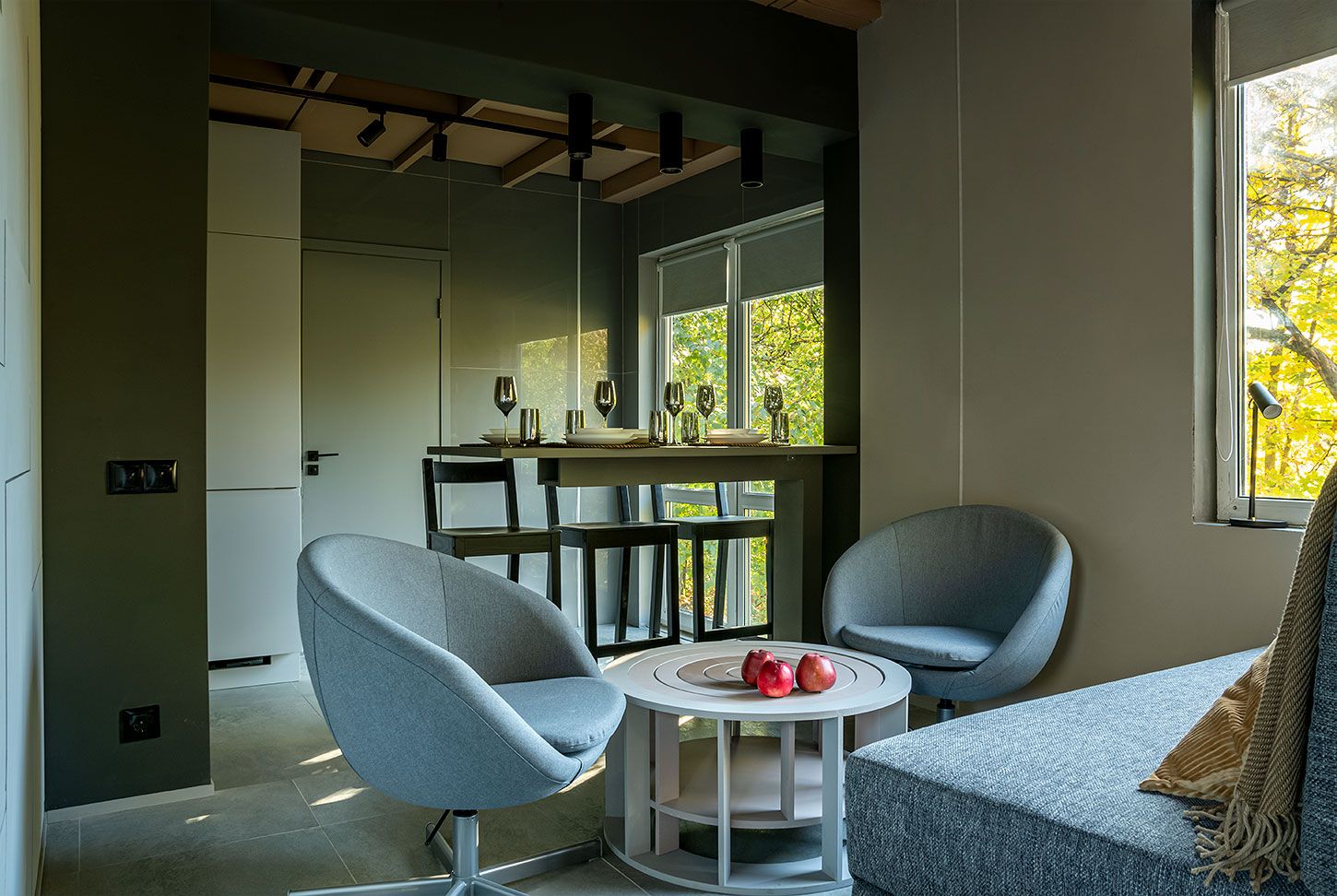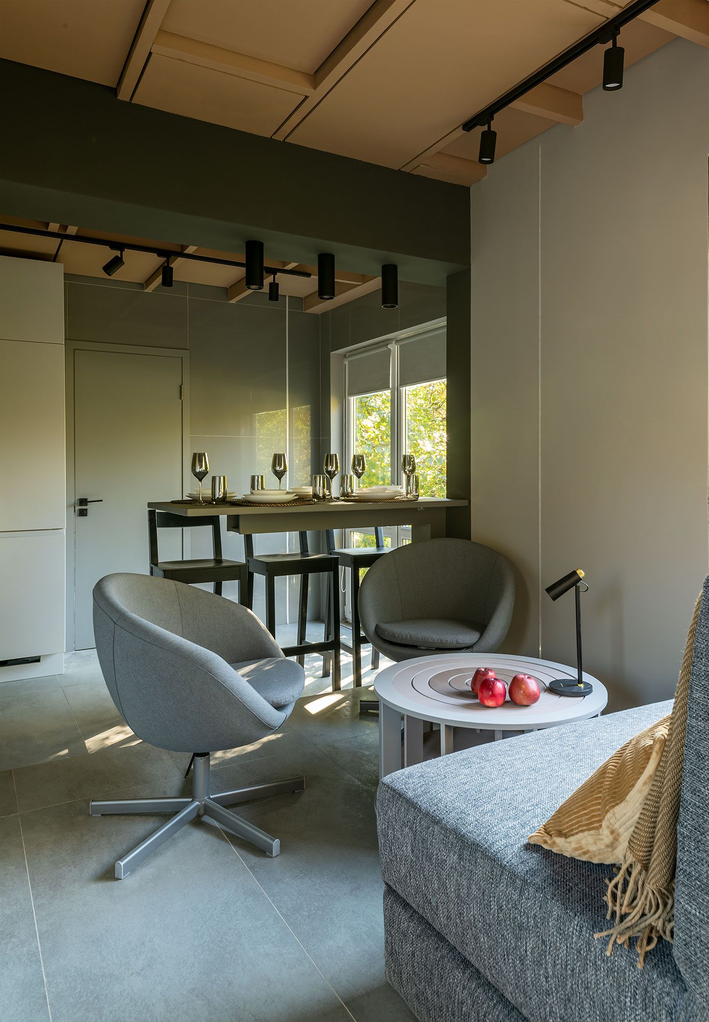 Небольшое пространство объединило кухню, гостиную, прихожую и место для хранения вещей. Дизайнер Денис Олексиюк превратил недостаток места в достоинство и функциональную особенность помещения.