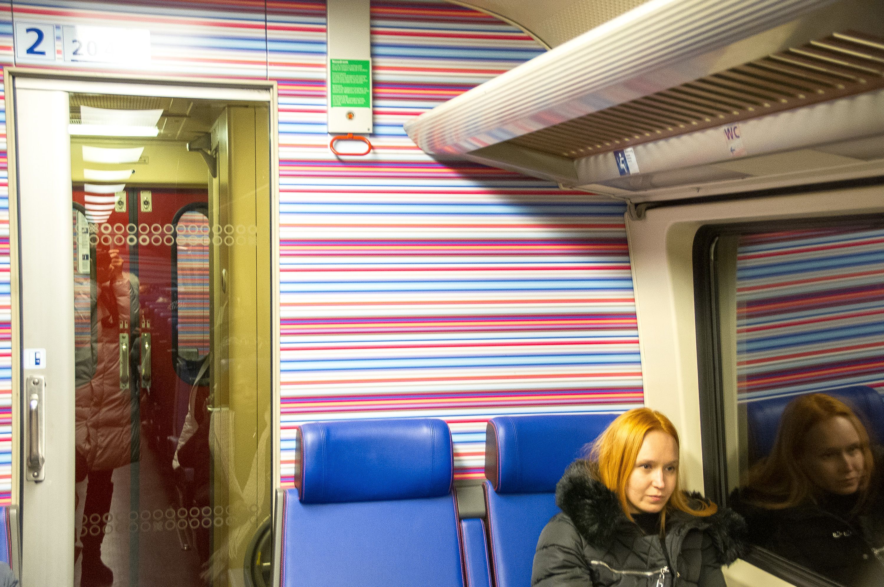 О цели следующей остановки напомнила разноцветная полоска в вагоне поезда:
