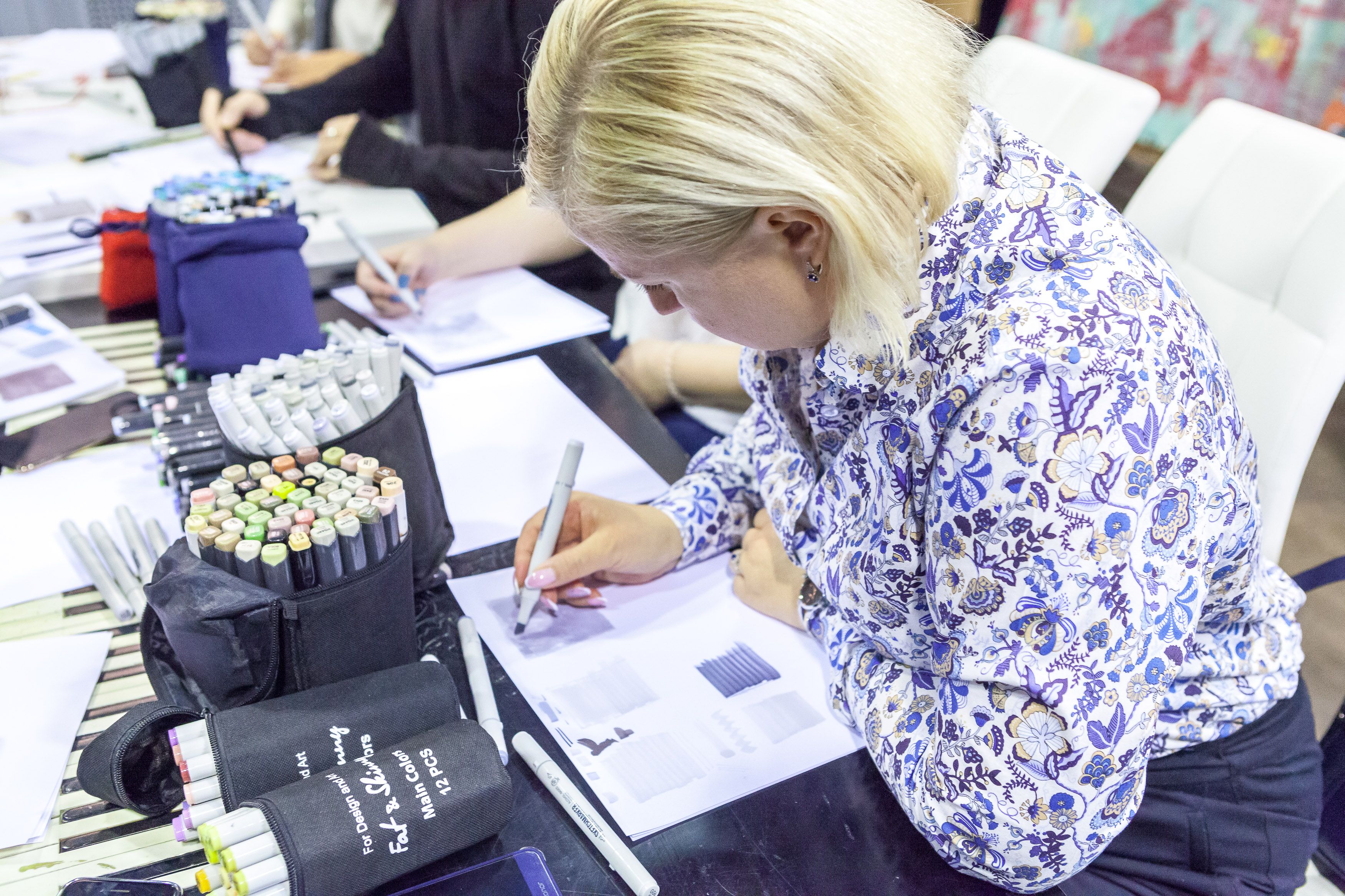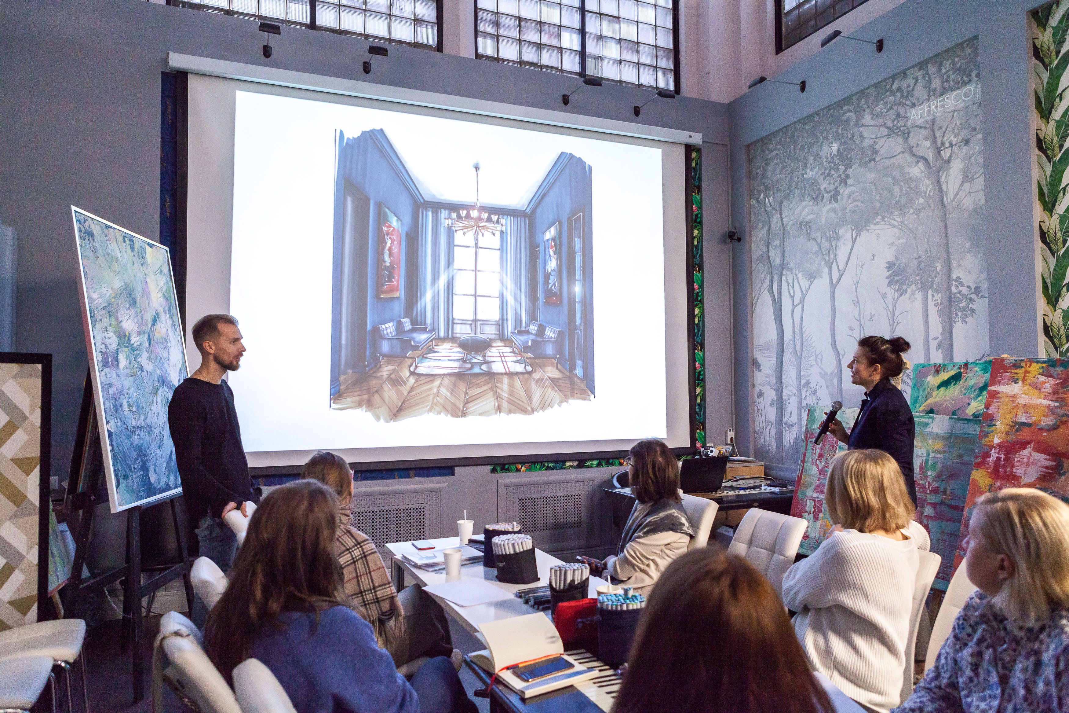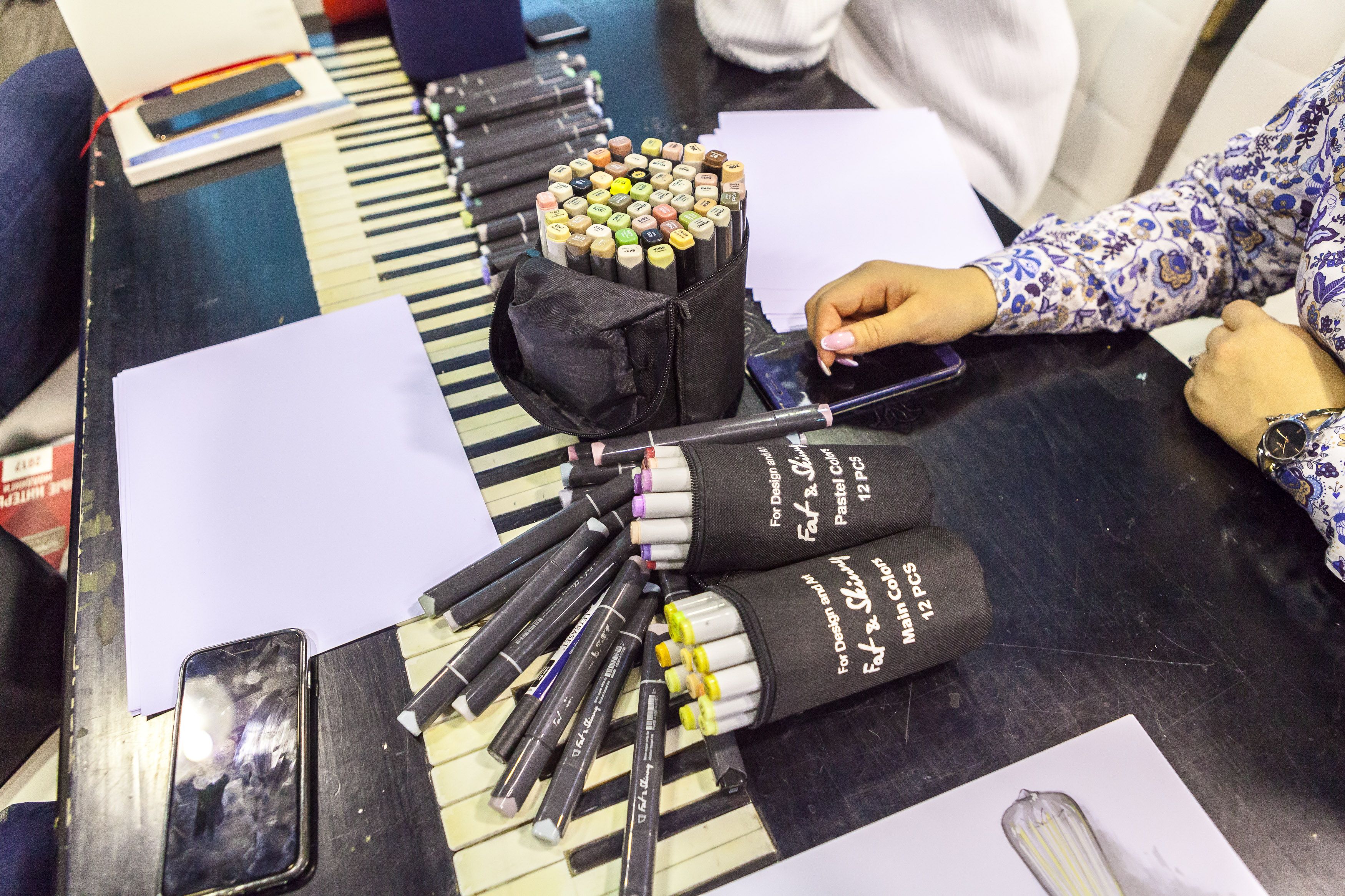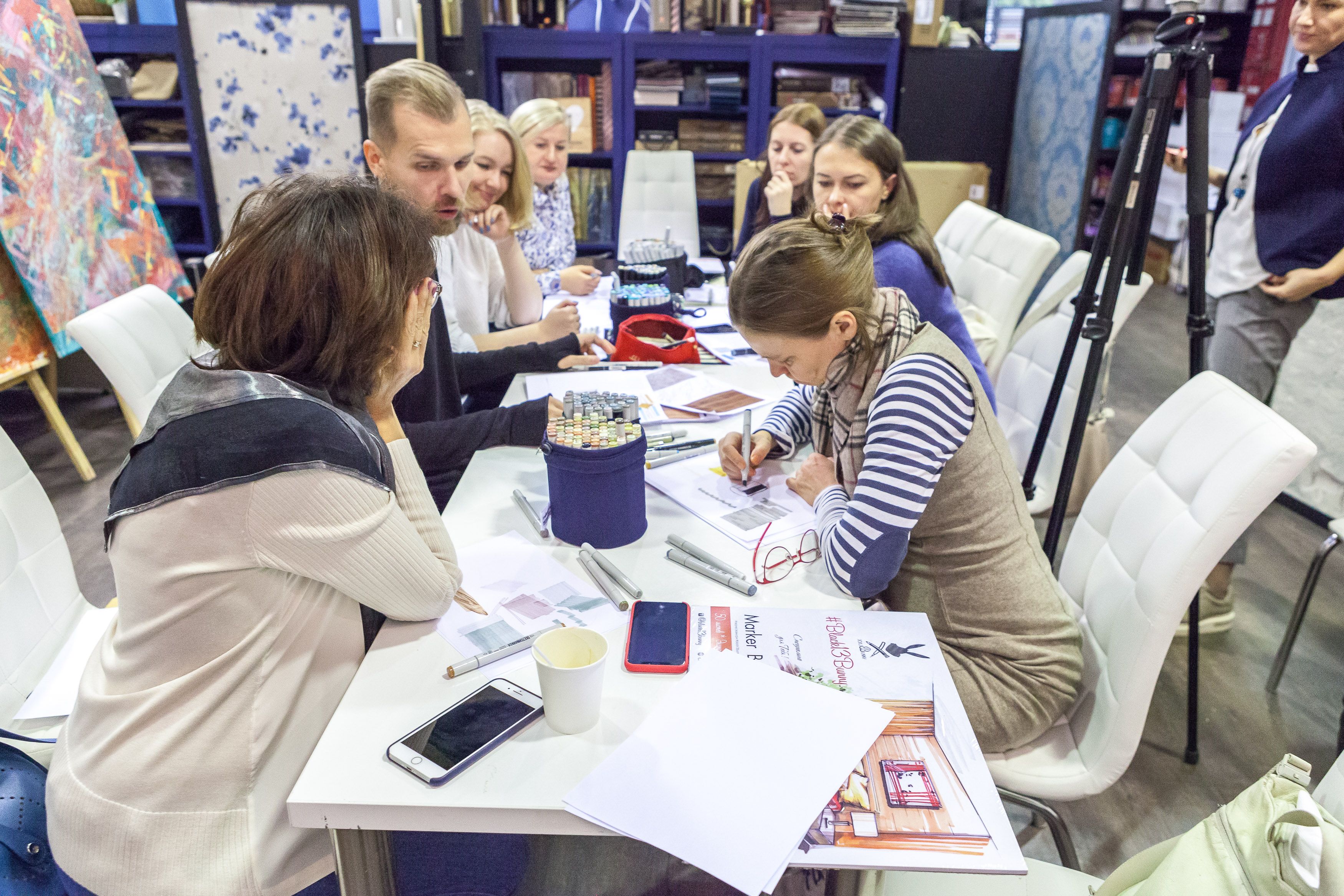 Участники мастер-класса подробно познакомились с основными материалами для создания скетча: маркерами, маркерной бумагой, линерами, а также узнали, как применять скетчи в интерьерных проектах и перейти от 3D к ручной подаче и зарисовкам.