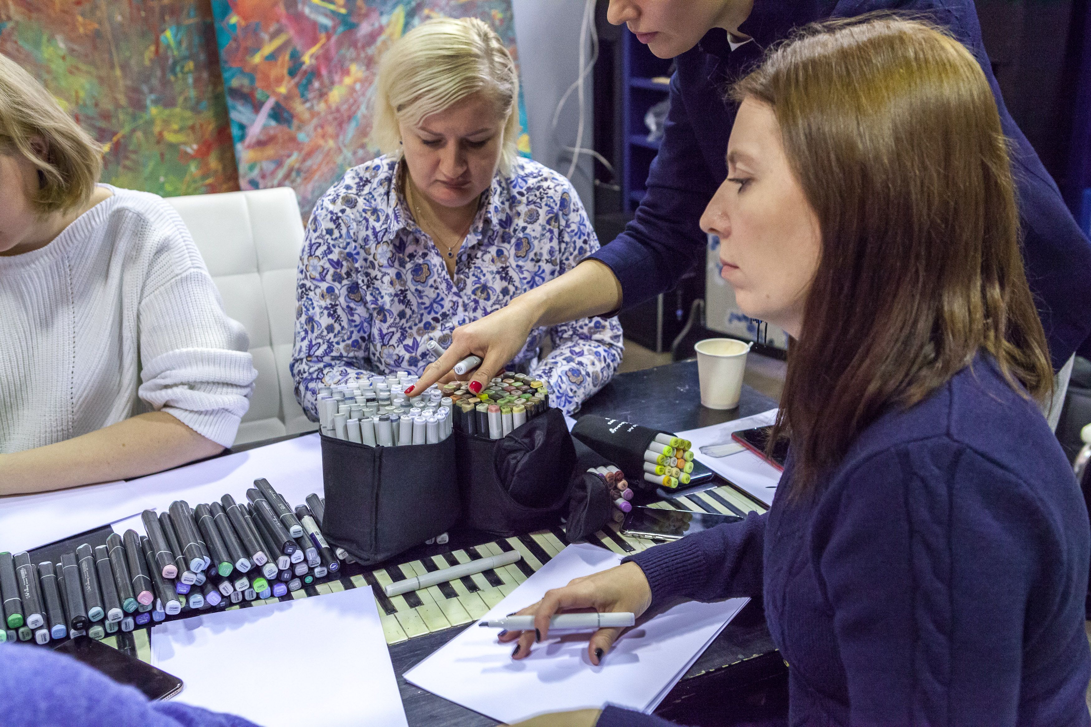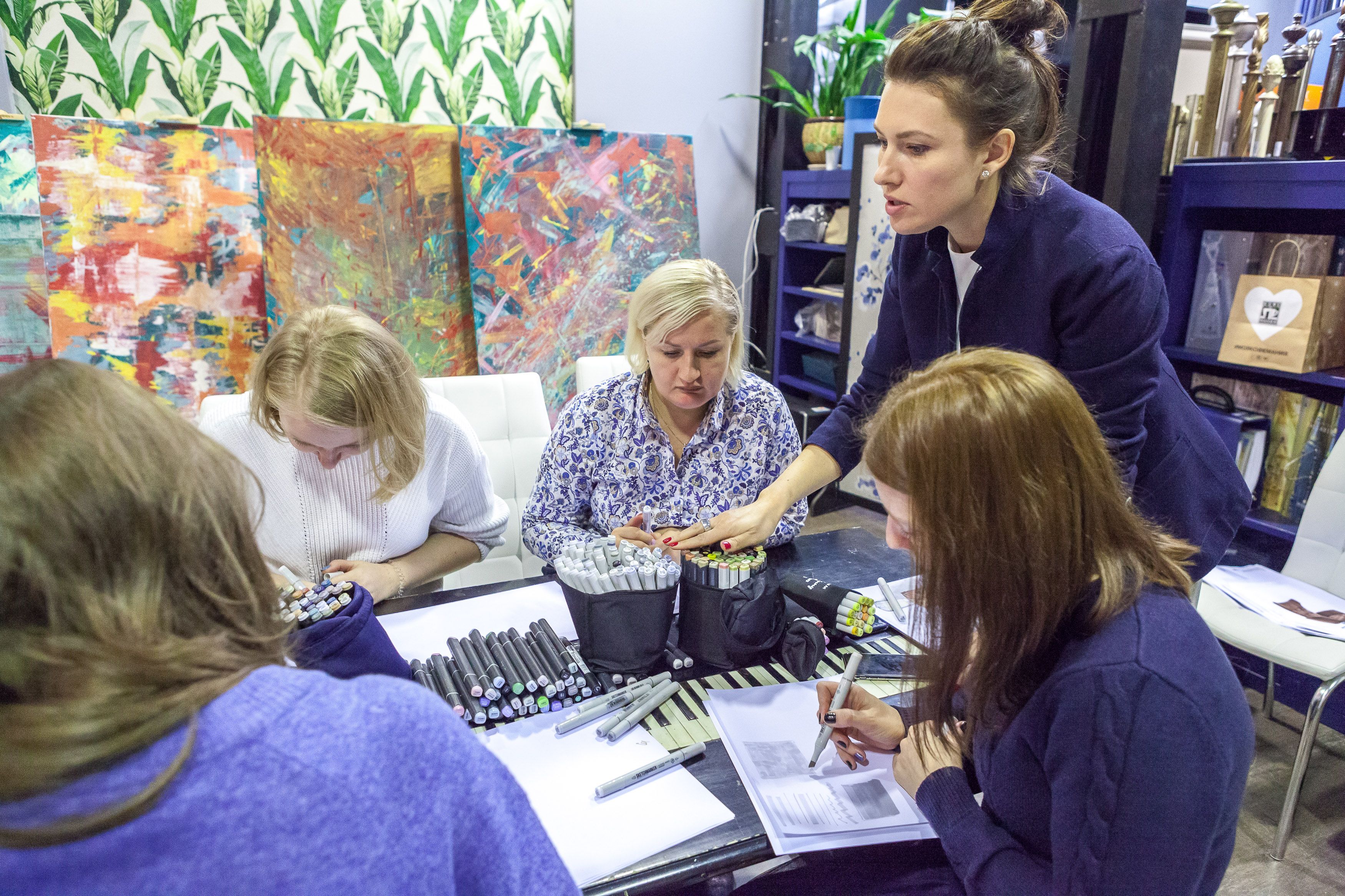 Все прошло замечательно! Мы рассказали про новые материалы, как и где дизайнерам применять технику скетча. И, конечно, попробовали порисовать! Наш художник рисовал различные текстуры, а девочки повторяли.