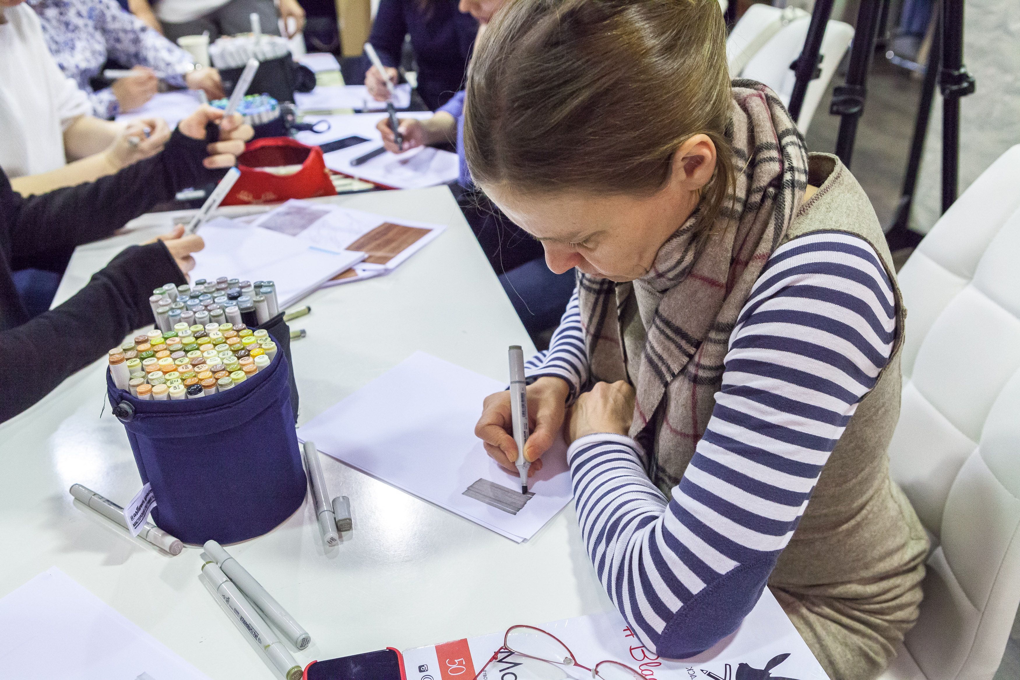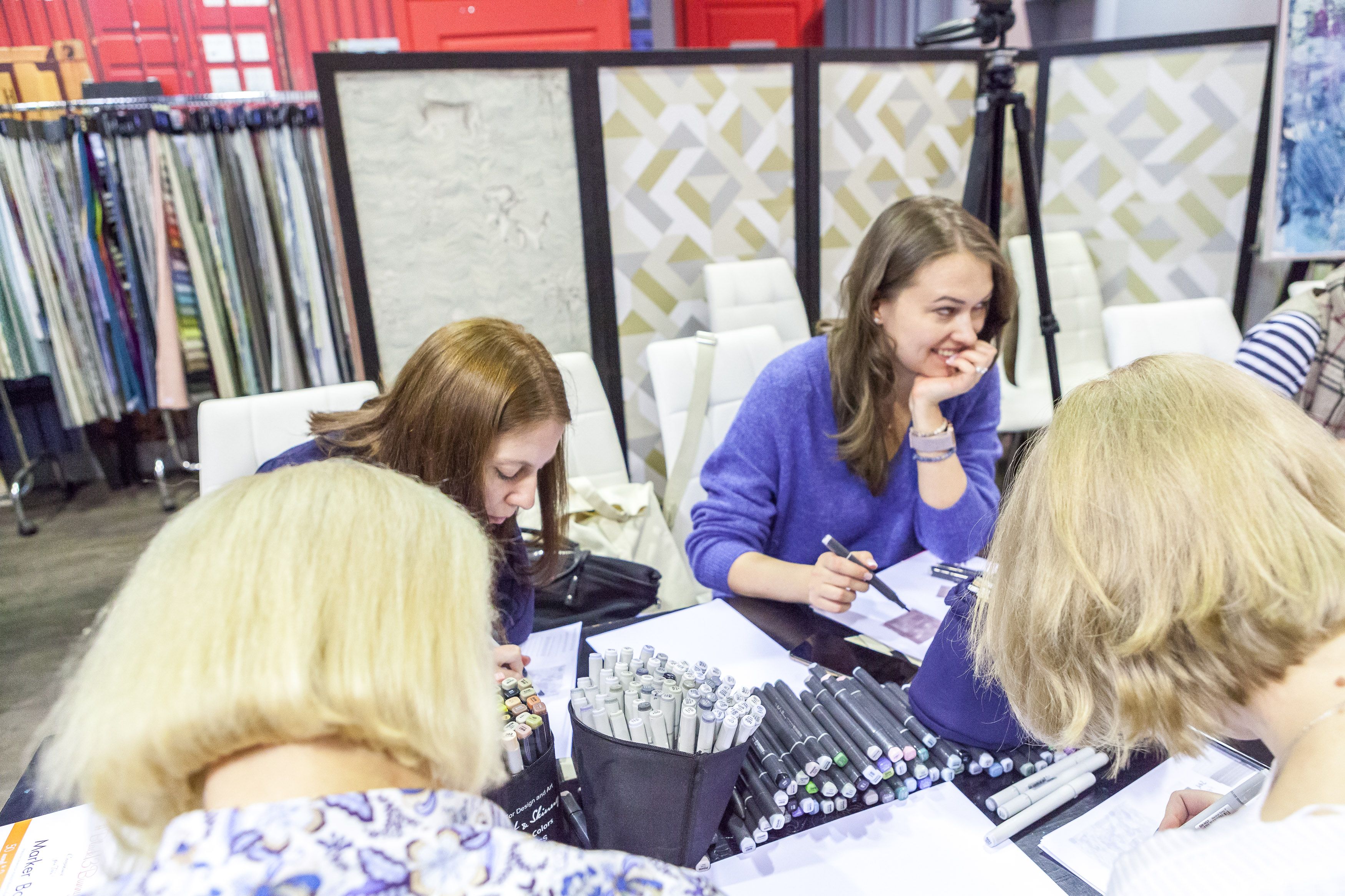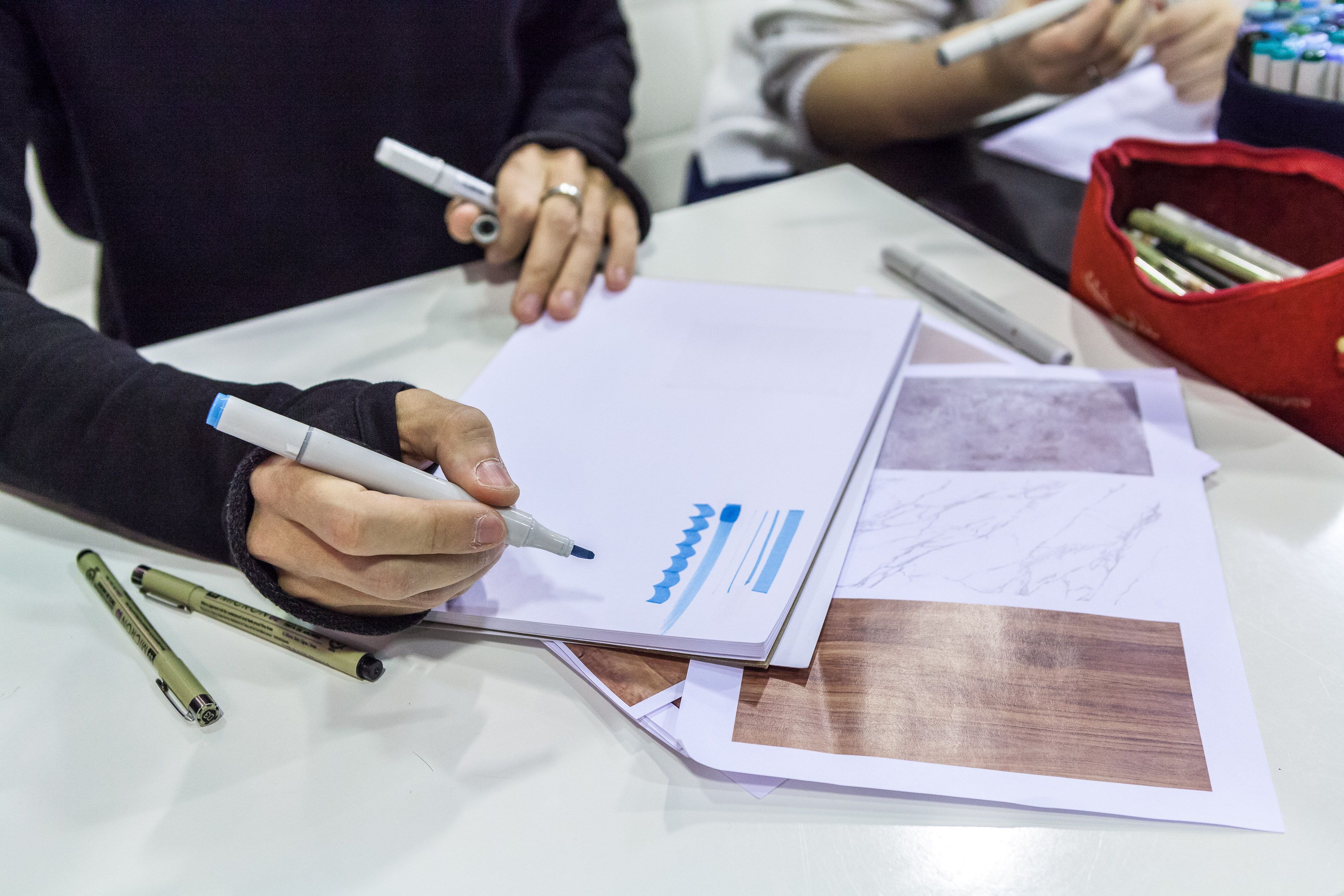 Создатели проекта Юлия Леви и Андрей Скобинов показали участникам, как зарисовывать маркерами популярные в интерьерах текстуры: дерево, бетон, мрамор, стекло.