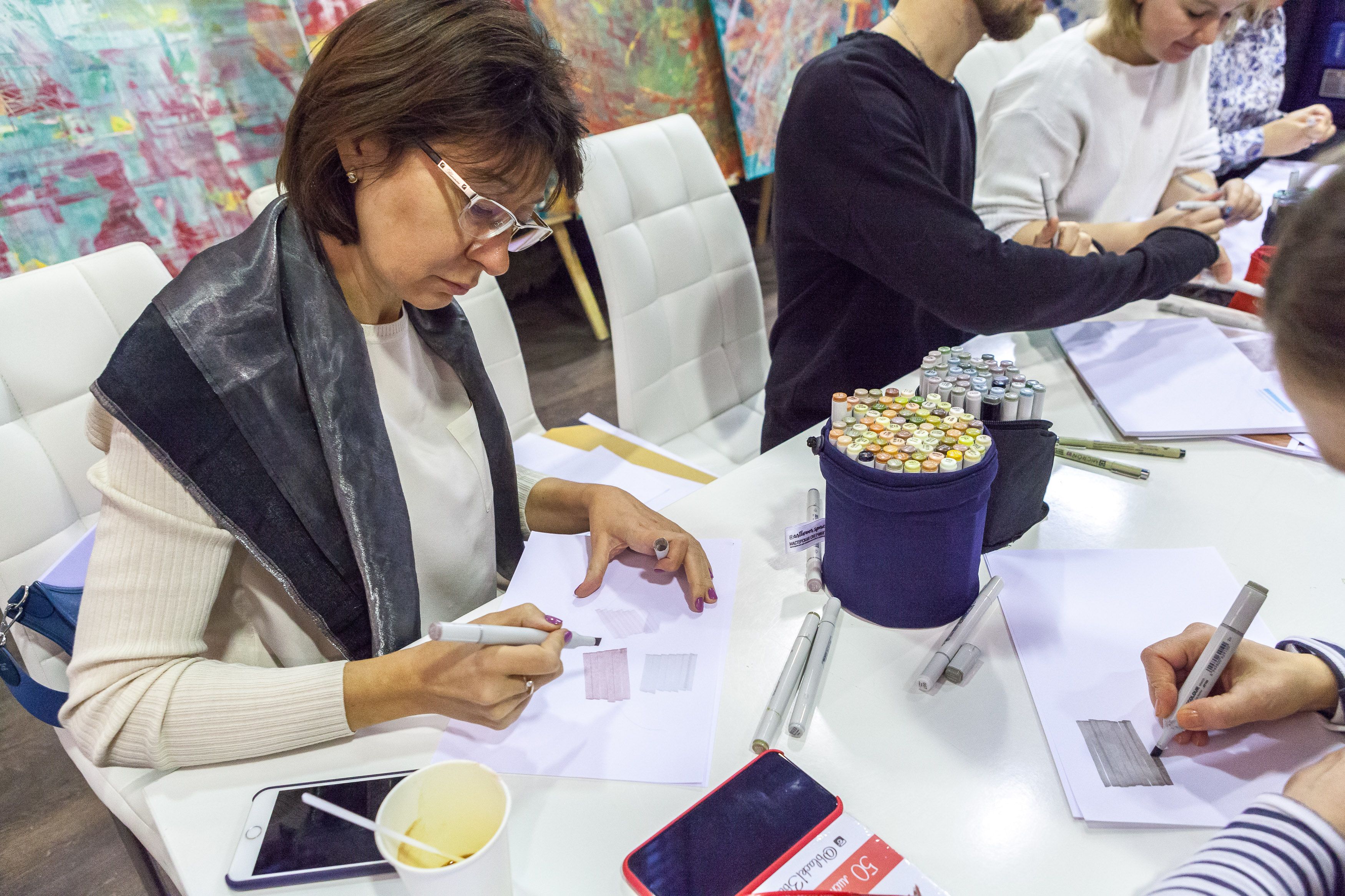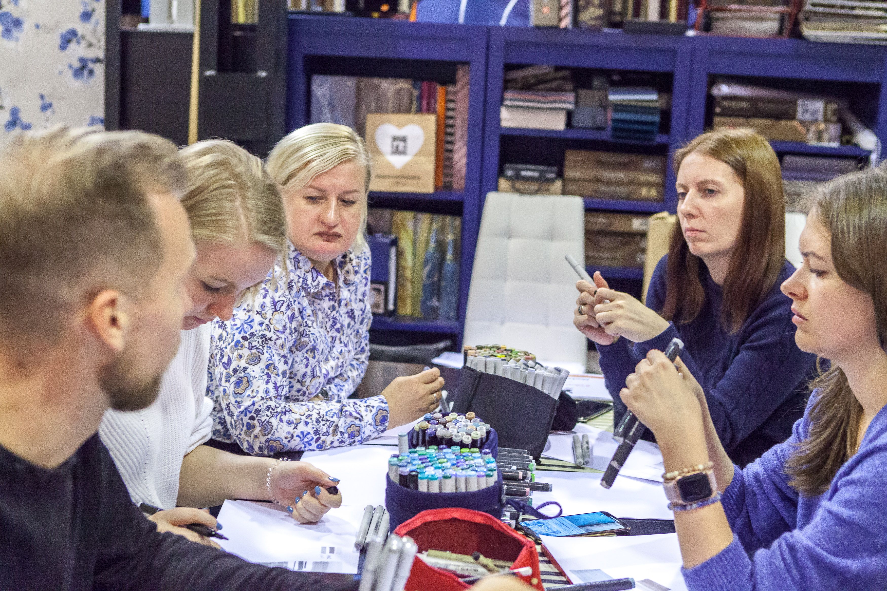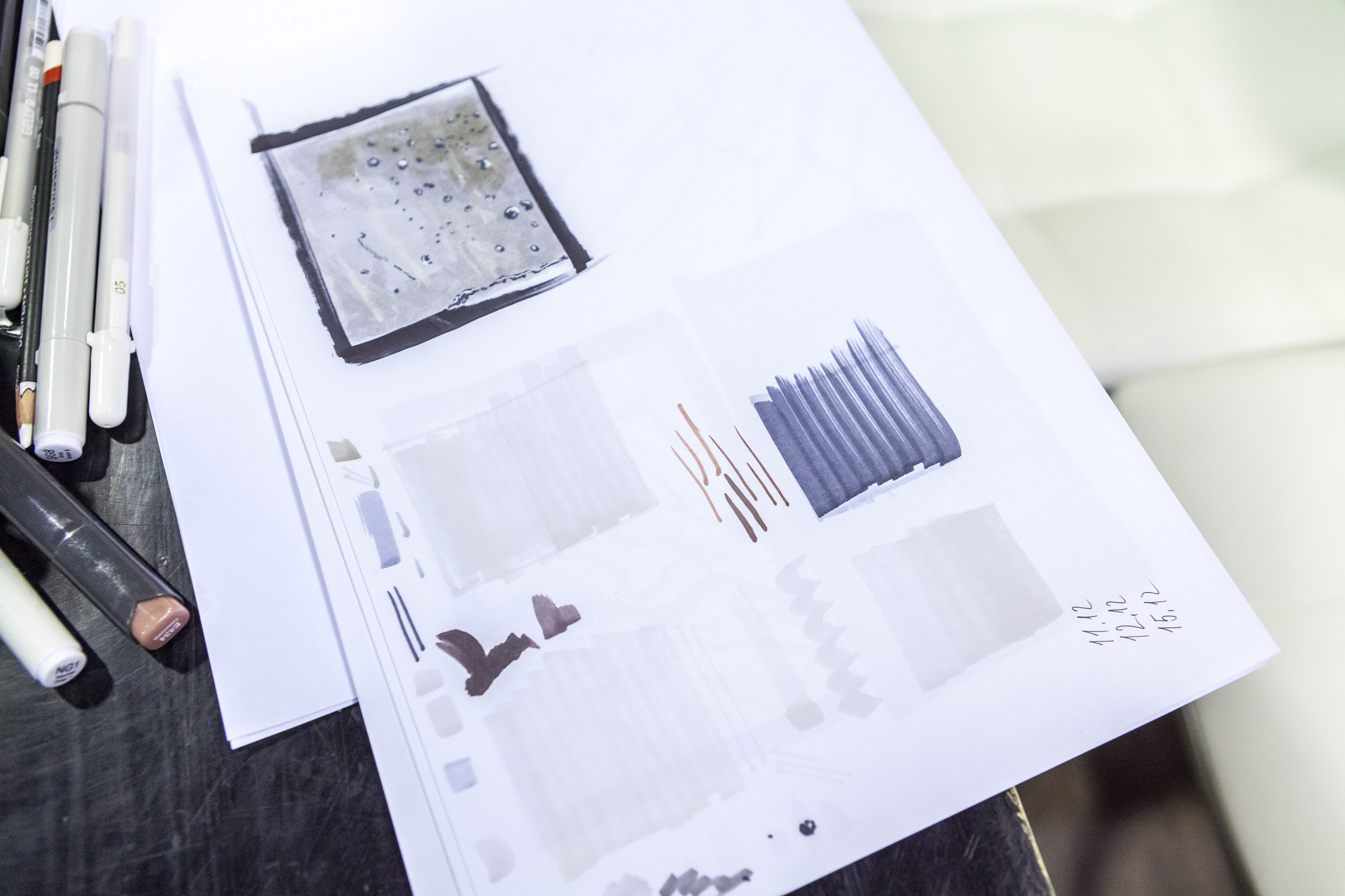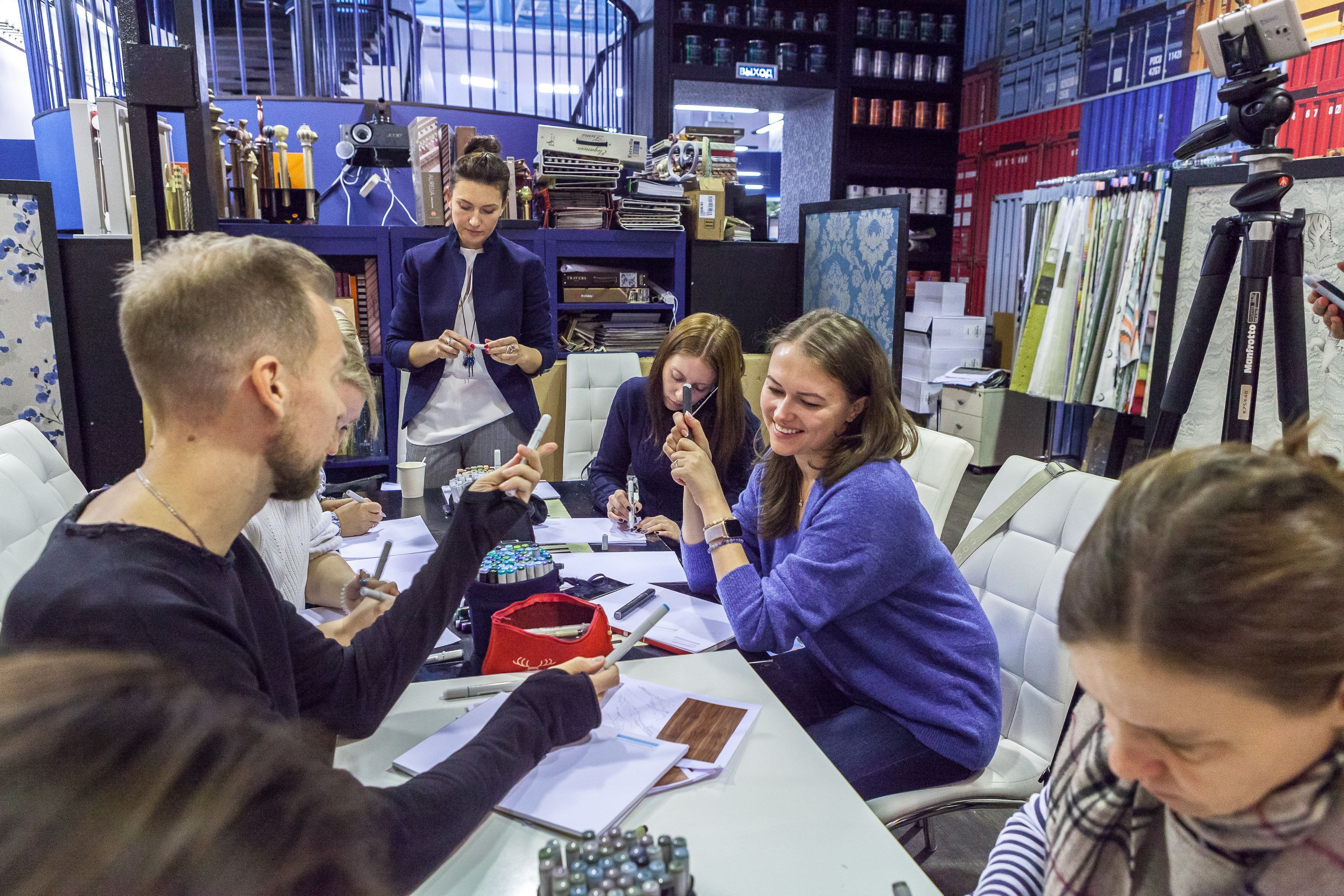 Создатели проекта Юлия Леви и Андрей Скобинов показали участникам, как зарисовывать маркерами популярные в интерьерах текстуры: дерево, бетон, мрамор, стекло.