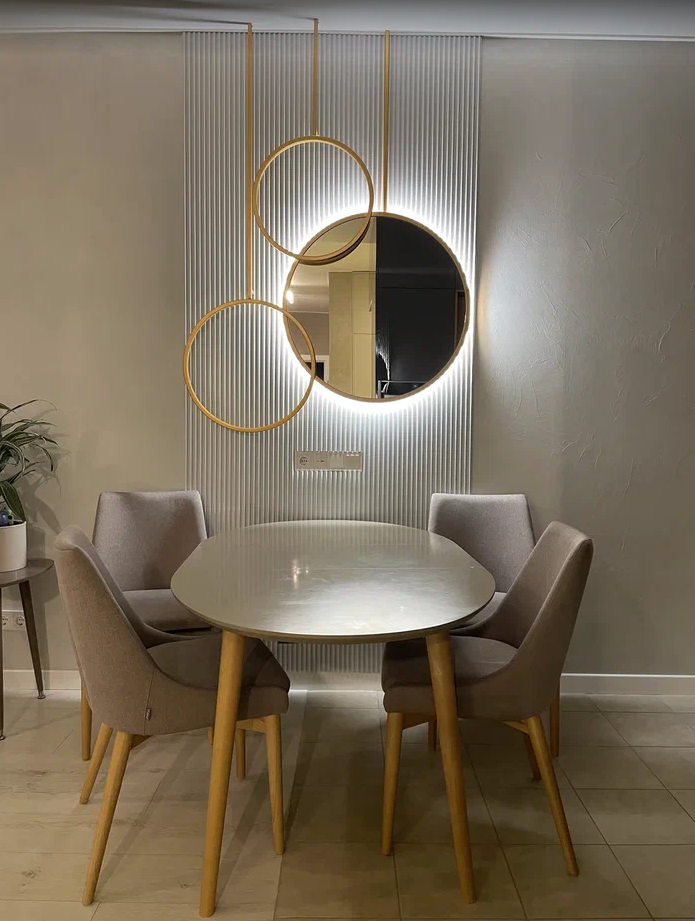 В обеденной зоне гостиной — декоративные панели Oraс Décor W108 из коллекции 3D Wall Covering дизайнера Орио Тонини.