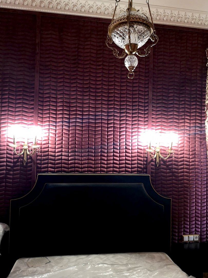 Стильное интерьерное решение — стёганые обои Chesterwall в сочетании с лепниной Orac Decor в Академии Orac в Калужской области.
