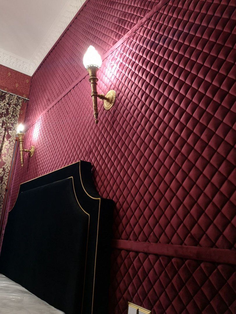 Для оформления интерьера дизайнеры выбрали оформление стен стегаными обоями Chesterwall полностью. Теплые и уютные обои в цвете «Wine», дизайны — Rhombus и Modern.