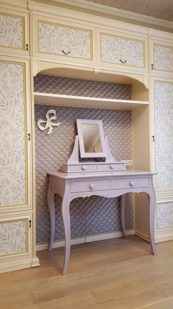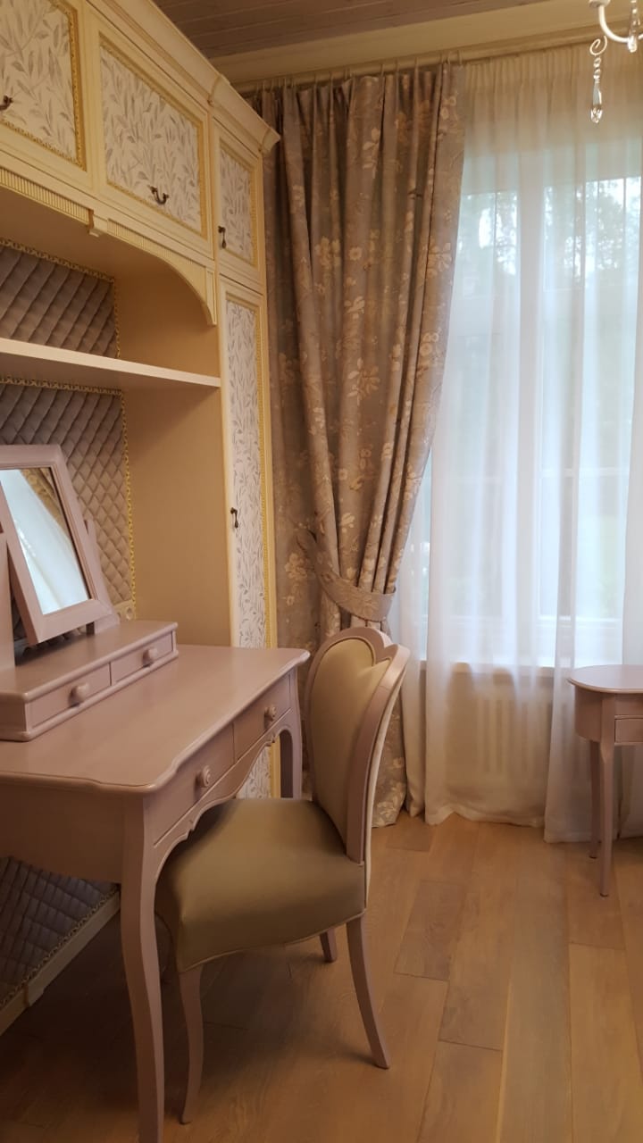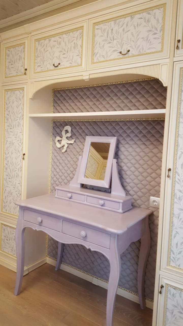 По-настоящему уютный интерьер в оттенках бежевого цвета. Зона туалетного столика оформлена обоями Chesterwall, дизайн — Royal.