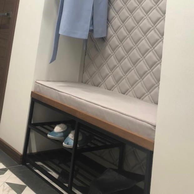Практичное решение дополнено уютным пуфиком для стильной банкетки, который сшит в Швейном цехе Ампир Декор из того же нежного велюра Chesterwall. Дизайн Plaid в бежевом цвете.