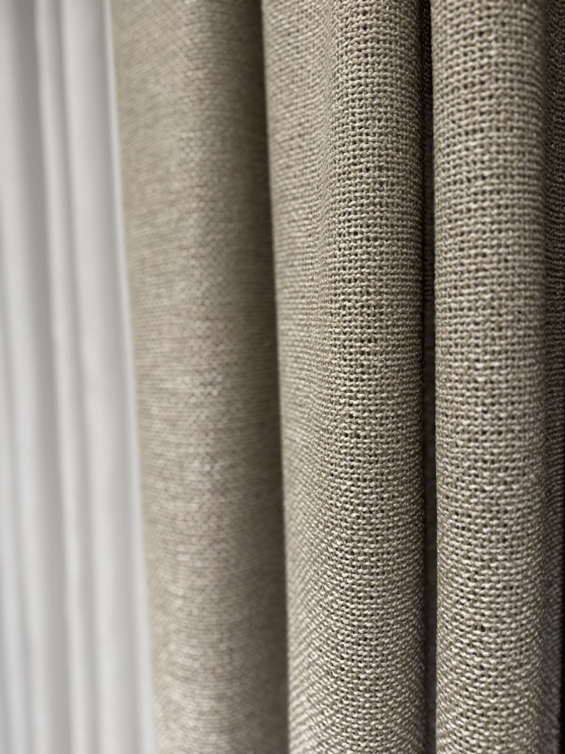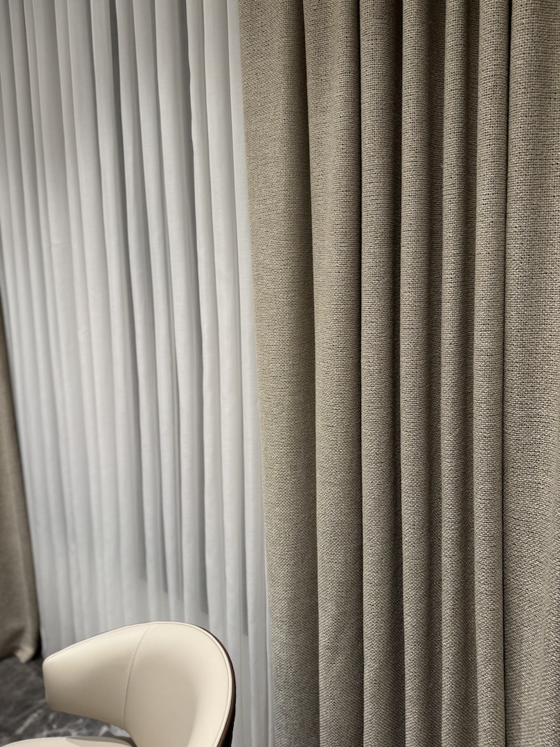 Ручная складка «Волна» крупная и ровная: она визуально приподнимает потолок, придаёт проёму архитектурную чистоту и порядок. Лёгкий напуск на пол смягчает жёсткость каменного покрытия и добавляет элегантности движению ткани.