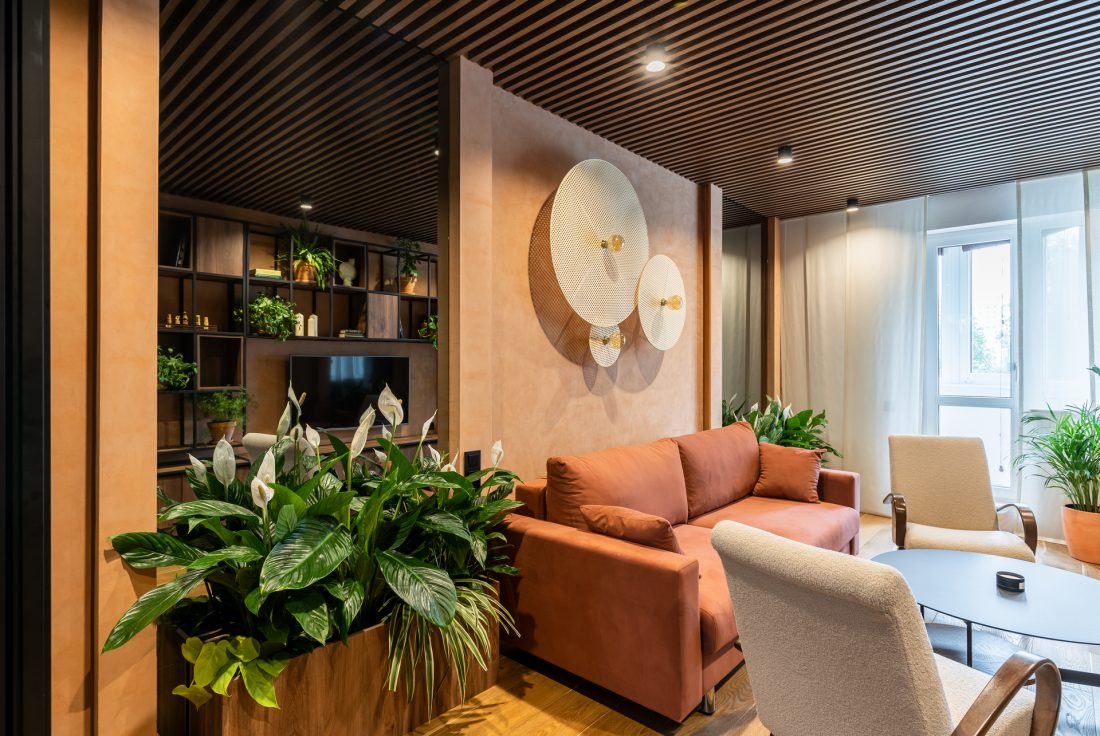 Дизайнер Ася Бондарева создала в гостиной тропический рай — оформила интерьер в виде оазиса, где увлечению хозяйки найдется много места и комнатные растения станут настоящим украшением пространства. Основная идея переделки – организовать атмосферу релакса и комфорта, чтобы вся семья смогла отдыхать, мысленно перемещаясь в излюбленные уголки своих путешествий.