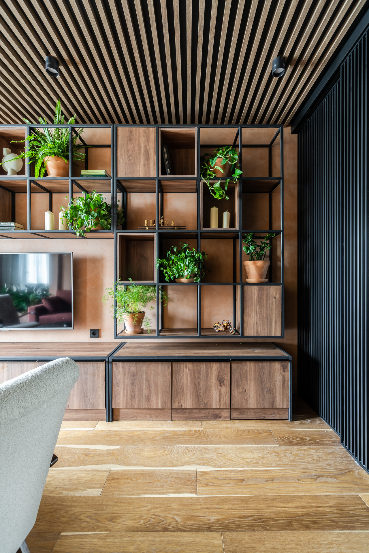 Героев решено было удивить черным потолком. На подготовленную поверхность плотным слоем легла глубокоматовая краска Mallers. Перспективу создали с помощью полимерных реек, идеально точно повторяющих цвет и фактуру дуба. Для стены у окна дизайнер выбрала спокойный серый оттенок.