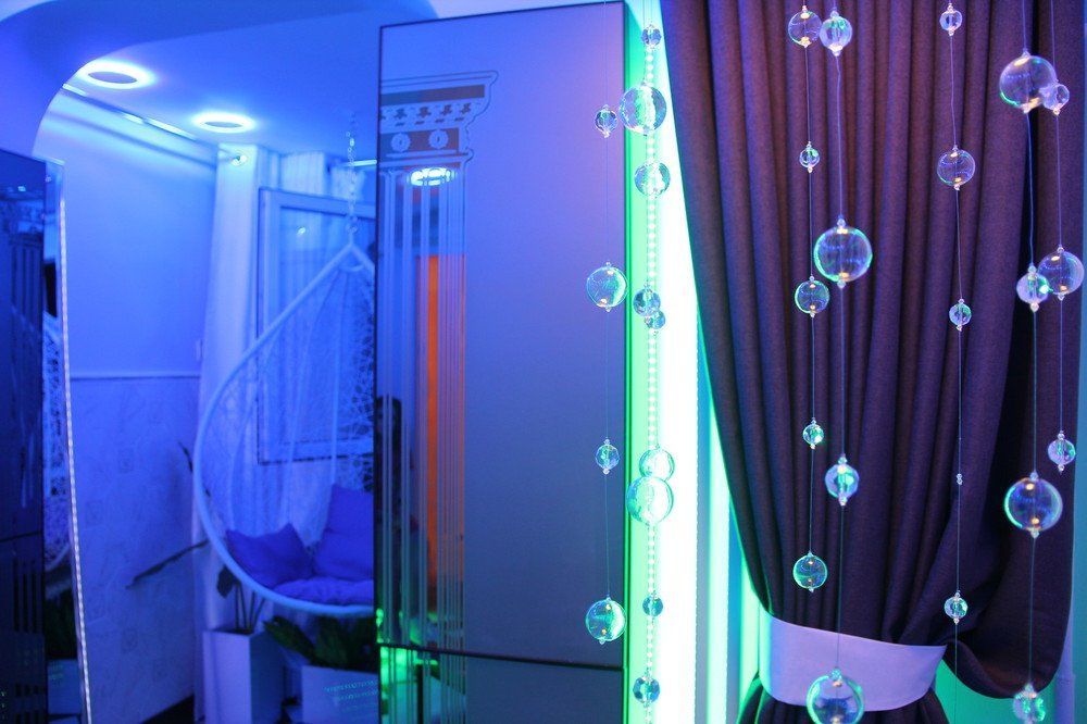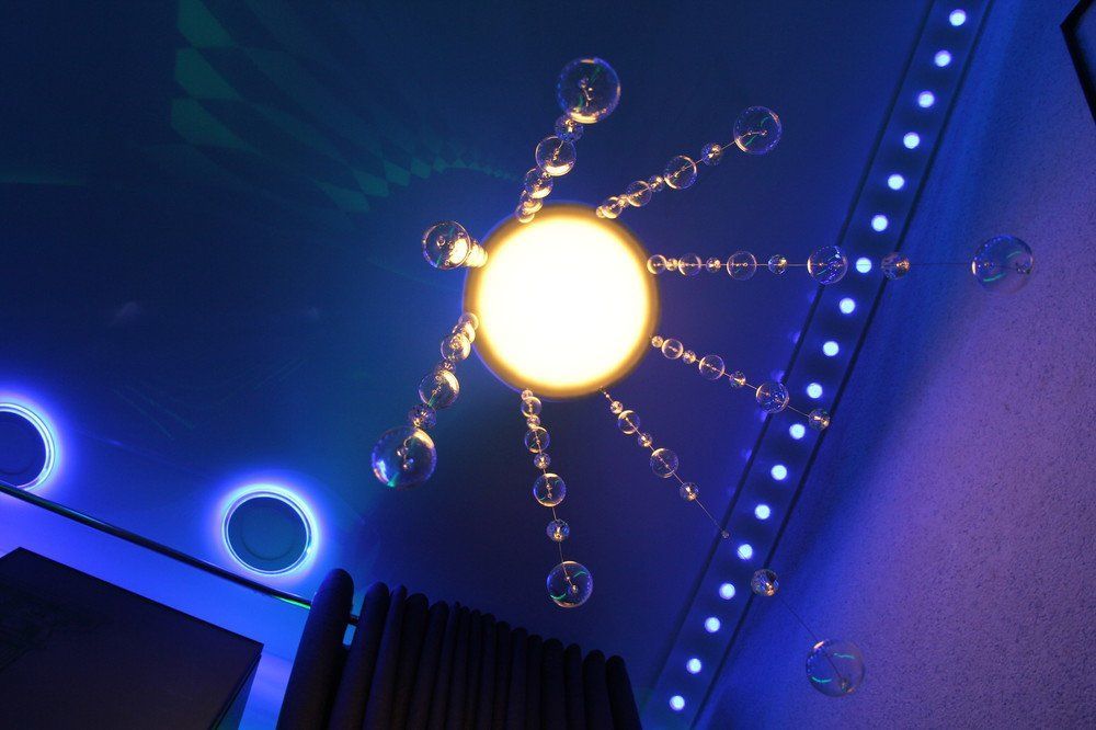 В проекте для конкурса Pinwin я использовала классическую лепнину для придания футуристическому интерьеру еще более космического звучания. В тело кронштейна инкрустировала стеклянные шарики и подсветила светодиодной лентой. То же было сделано с карнизом.